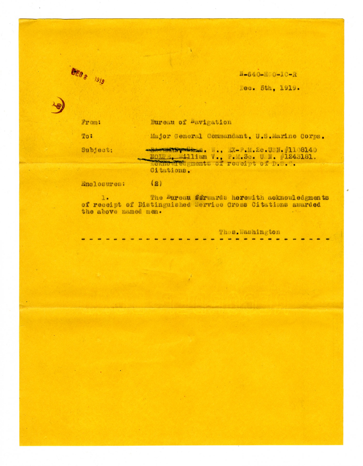 Bureau of Navigation letter to Major General Commanding, U.S. Marine Corps - December 5, 1919