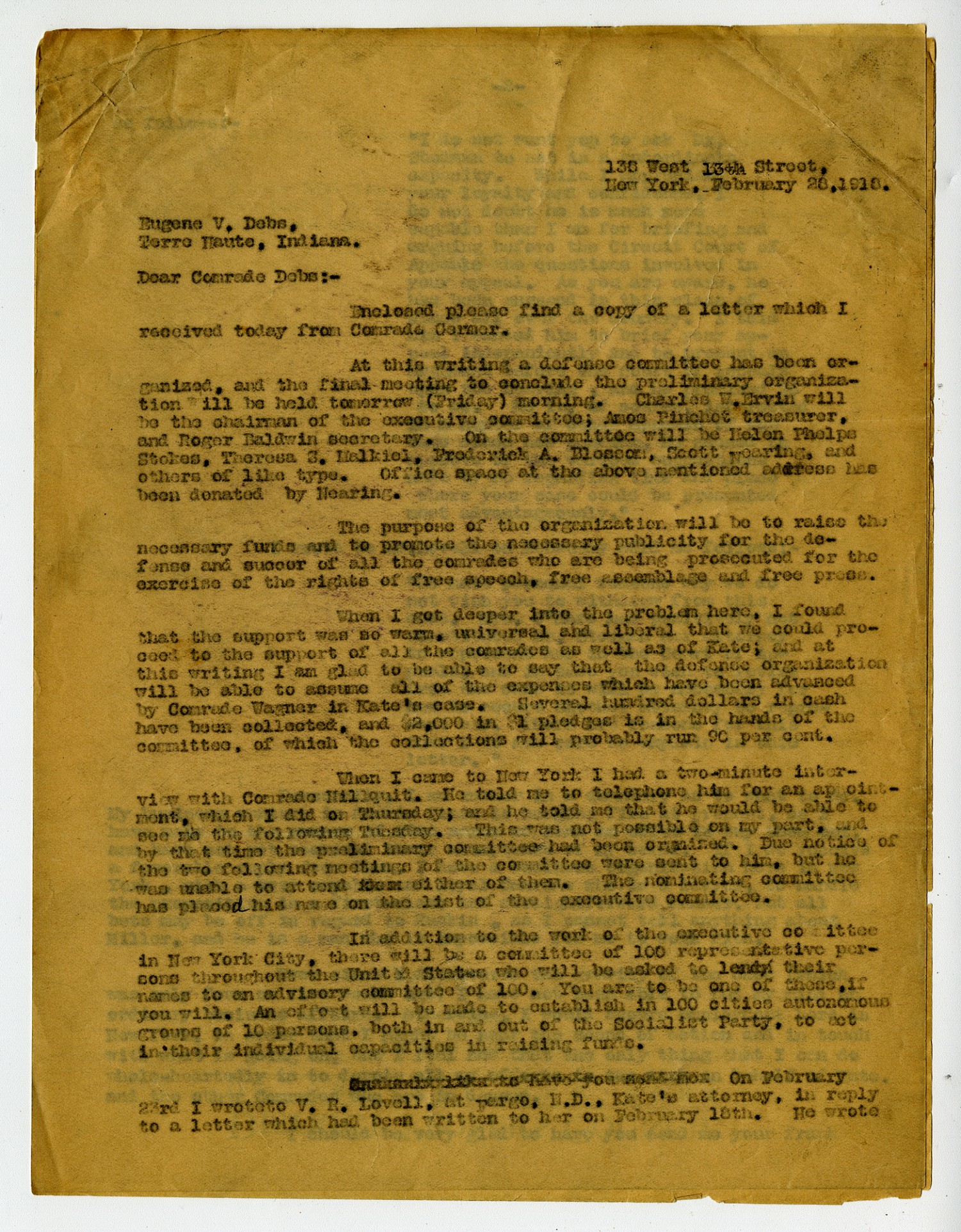 136 West 13th Street, New York, February 28, 1916. Eugene V. Debs Terre Haute, Indiana. Dear Comrade Debs:- Enclosed please find a copy of a letter which I received today from Comrade Carmer. At this writing a defense committee has been organized, and the final meeting to conclude the preliminary organization will be held tomorrow (Friday) morning. Charles W. Ervin will be the chairman of executive committee will be Helen Phelps Stokes, Theresa J. Malkiel, Frederick A. Blesson, Scott Nearing, and others of like type. Office space at the above mentioned address has been donated by Nearing. The purpose of the organization will be to raise the necessary funds and to promote the necessary publicity for the defense and succor of all the comrades who are being presecuted for the exercise of the rights of free speech, free assemblage and free press. When I get deeper into the problem here, I found that the support was so warm, universal and liberal that we could proceed to the support of all the comrades as well as of Kate; and at this writing I am glad to be able to say that the defense organization will be able to assume all of the expenses which have been advanced by Comrade Wagner in Kate