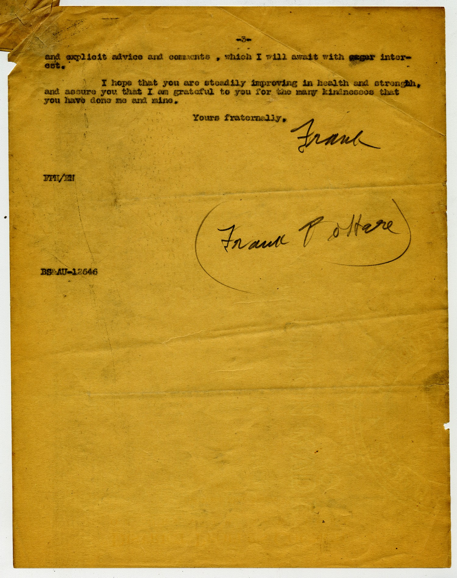 [page 3] and explicit advice and comments, which I will await with eager interest. I hope that you are steadily improving in health strength and assure you that I am grateful to you for the many kindnesses that you have done me and mine. Yours fraternally, Frank FPH/ EN BSA AuU-12646
