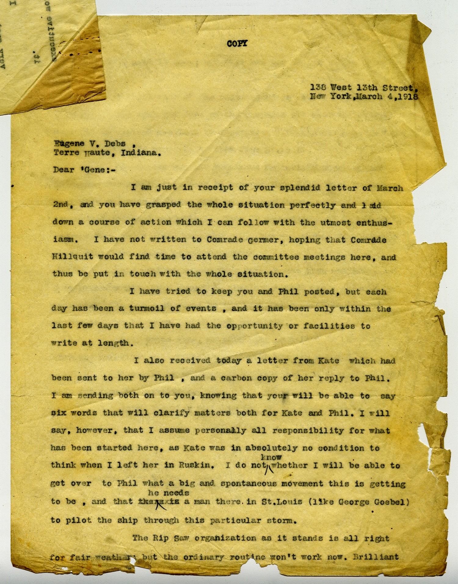 COPY 138 West 13th Street New York, March 4, 1918 Eugene V. Debs Terre Haute, Indiana, Dear