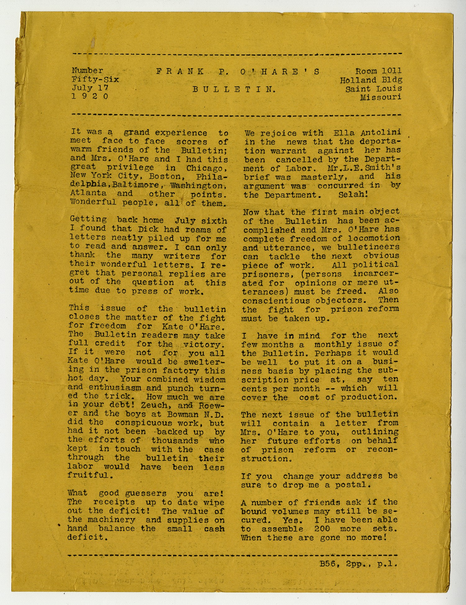 | Title | Frank P. O'Hare's Bulletin Number 56 - July 17, 1920 |