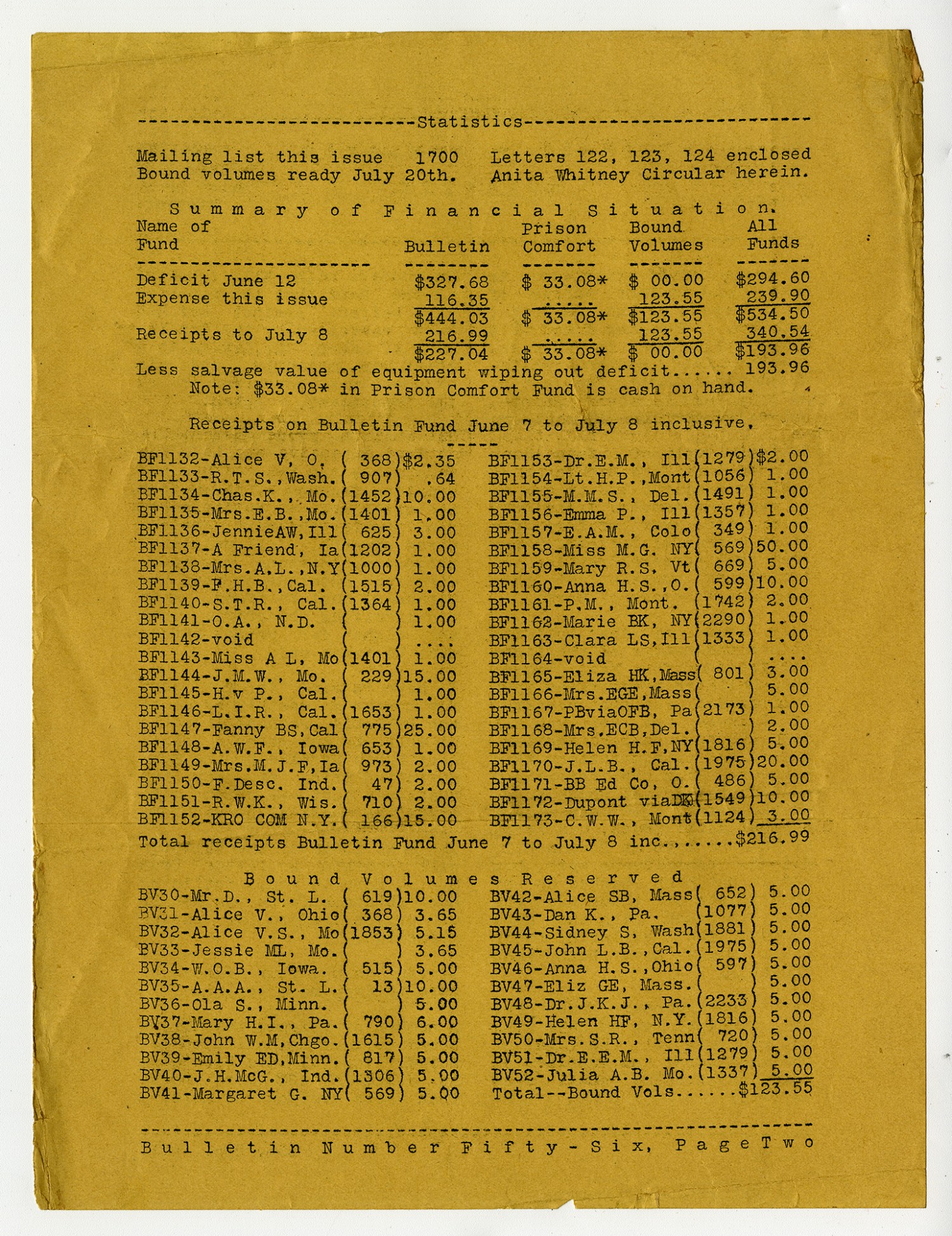 [page 2] .....Statistics..... Mailing list this issue 1700 Bound volumes ready July 20th. Letter 122, 123, 124 enclosed Anita Whitney Circular herein SUMMARY OF FINANCIAL SITUATION Name of Fund Bulletin Prison Comfort Bound Volumes All Funds Deficit June 12 $327.68 $33.08* $00.00 $294.60 Expense this issue 116.35 .... 123.55 239.90 $444.03 $33.08* $123.55 $534.50 Receipts of July 8 216.99 .... 123.55 340.54 $227.04 $33.08* $00.00 $193.96 Less salvage value of equipment wiping out deficit....193.96 Note: $33.08* in Prison Comfort Fund is cash on hand. Receipts on Bulletin Fund June 7 to July 8 inclusive. BF1132- Alice V, O, ( 368) $2.35 BF1133-R.T.S., [Washington] ( 907) .64 BF1134