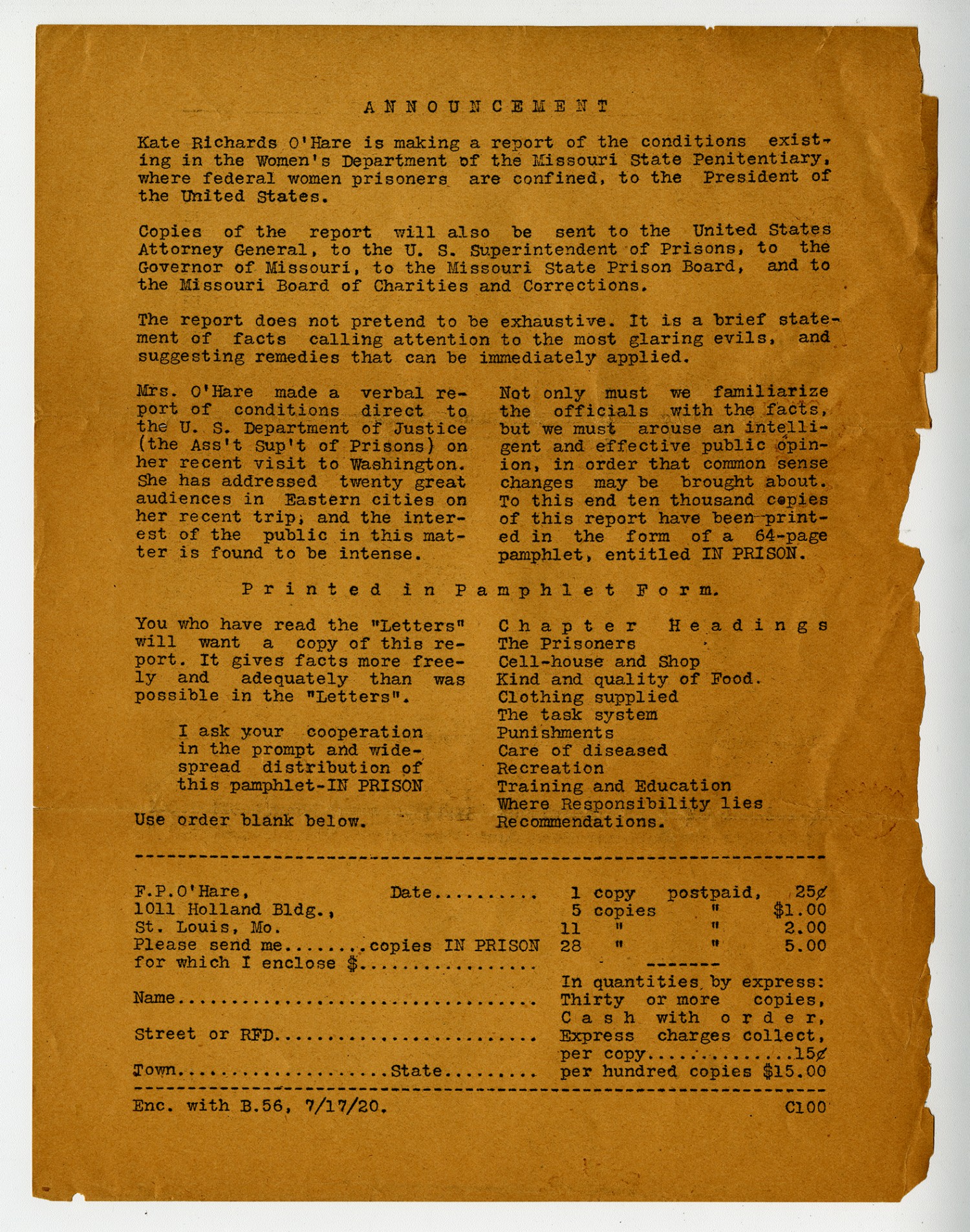 | Source | O'Hare, Frank P. Bulletin Number 56. 17 July 1920. Frank P. O'Hare Papers, 1850-1960. A1152. Missouri History Museum, Saint Louis, Missouri. |