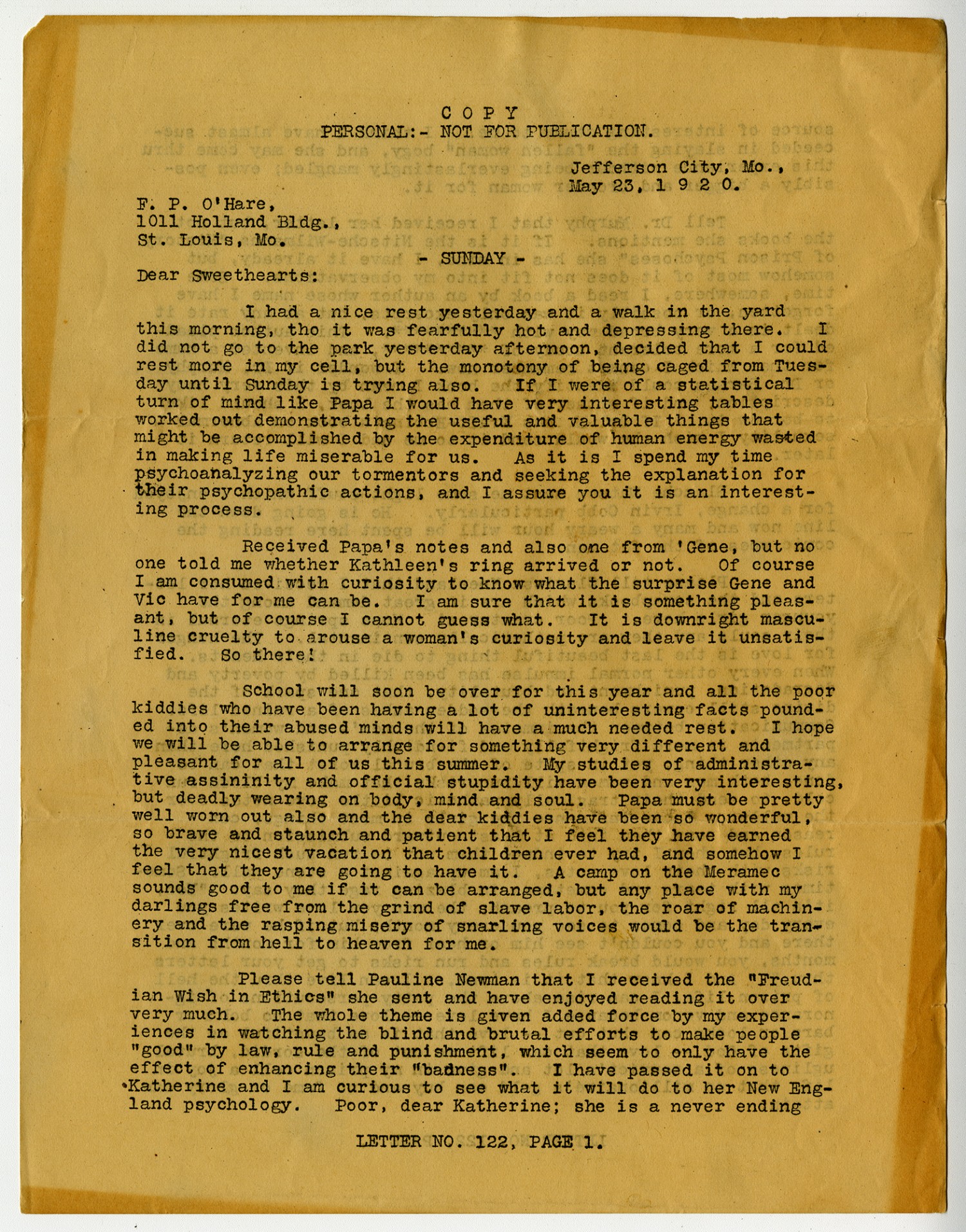 | Source | O'Hare, Kate. Letter to Sweethearts. 23 May 1920. Frank P. O'Hare Papers, 1850-1960. A1152. Missouri History Museum, Saint Louis, Missouri. |