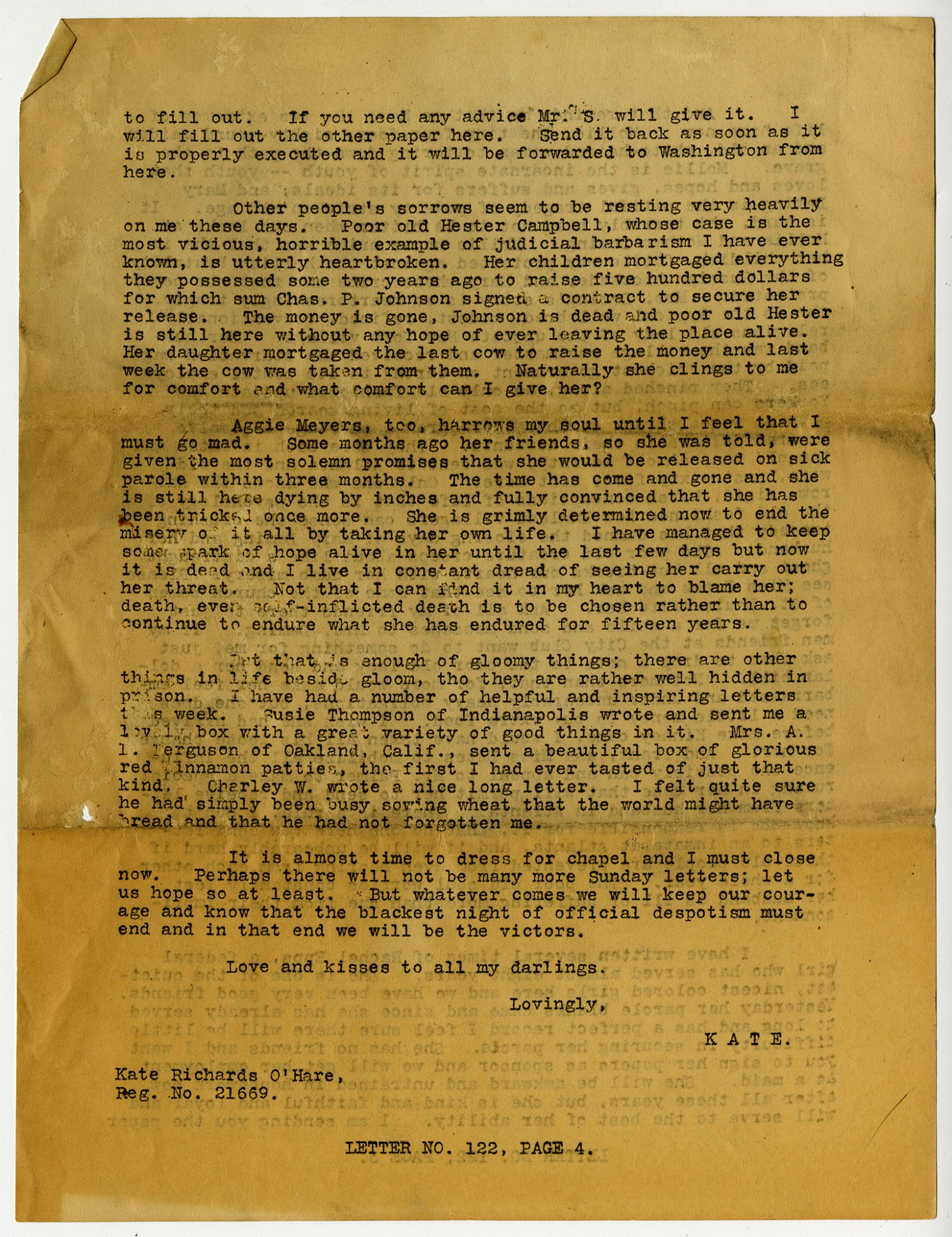 Kate O'Hare letter to Sweethearts - May 23, 1920