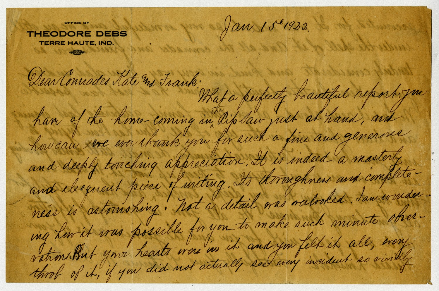 [January] 15th 1922. Dear Comrades Kate and Frank: What a perfectly beautiful report you have of the home-coming in the Rip Saw just at hand, and how can we ever thank you for such a fine and generous and deeply touching appreciation. It is indeed a masterly and eloquent piece of writing. Its thoroughness and completeness is astonishing. Not a detail was overlooked. I am wondering how it was possible for you to make such munite observations. But your hearts were in it and you felt it all, every throb of it, if you did not actually see every incident so vividly