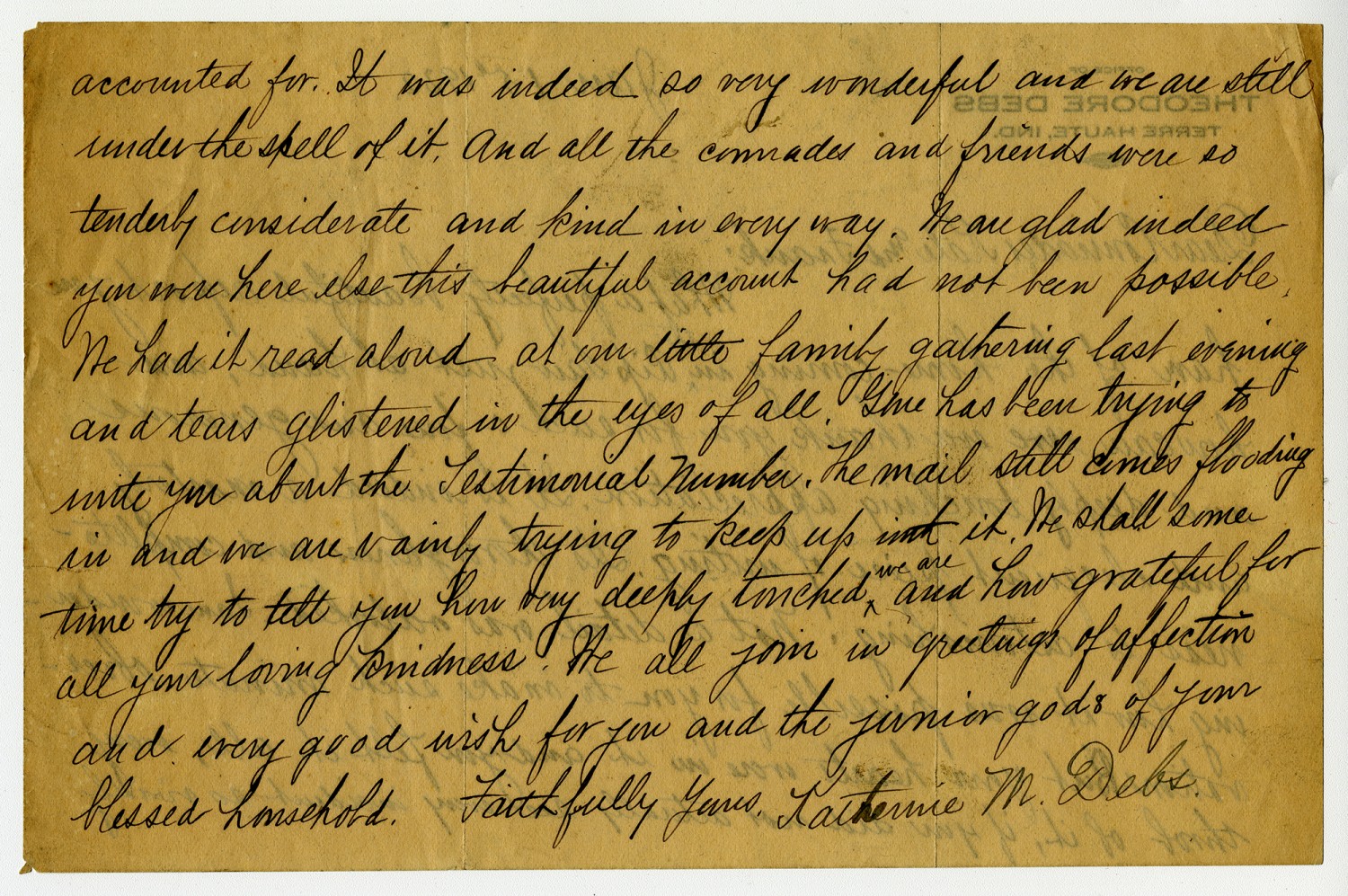 accounted for. It was indeed so very wonderful and we are still under the spell of it. And all the comrades and friends were so tenderly considerate and kind in every way. We are glad indeed you were here else this beautiful account had not been possible. We had it read aloud as on little family gathering last evening and tears glistened in the eyes of all. Gene has been trying to write you about the Testimonial Number. The mail still comes flooding in and we are vainly trying to keep up with it. We shall some time try to tell you how very deeply touched we are and how grateful for all your loving kindness. We all join in greetings of affection and every good wish for you and the junior gods of your blessed household. Faithfully yours, Katherine M. Debs.