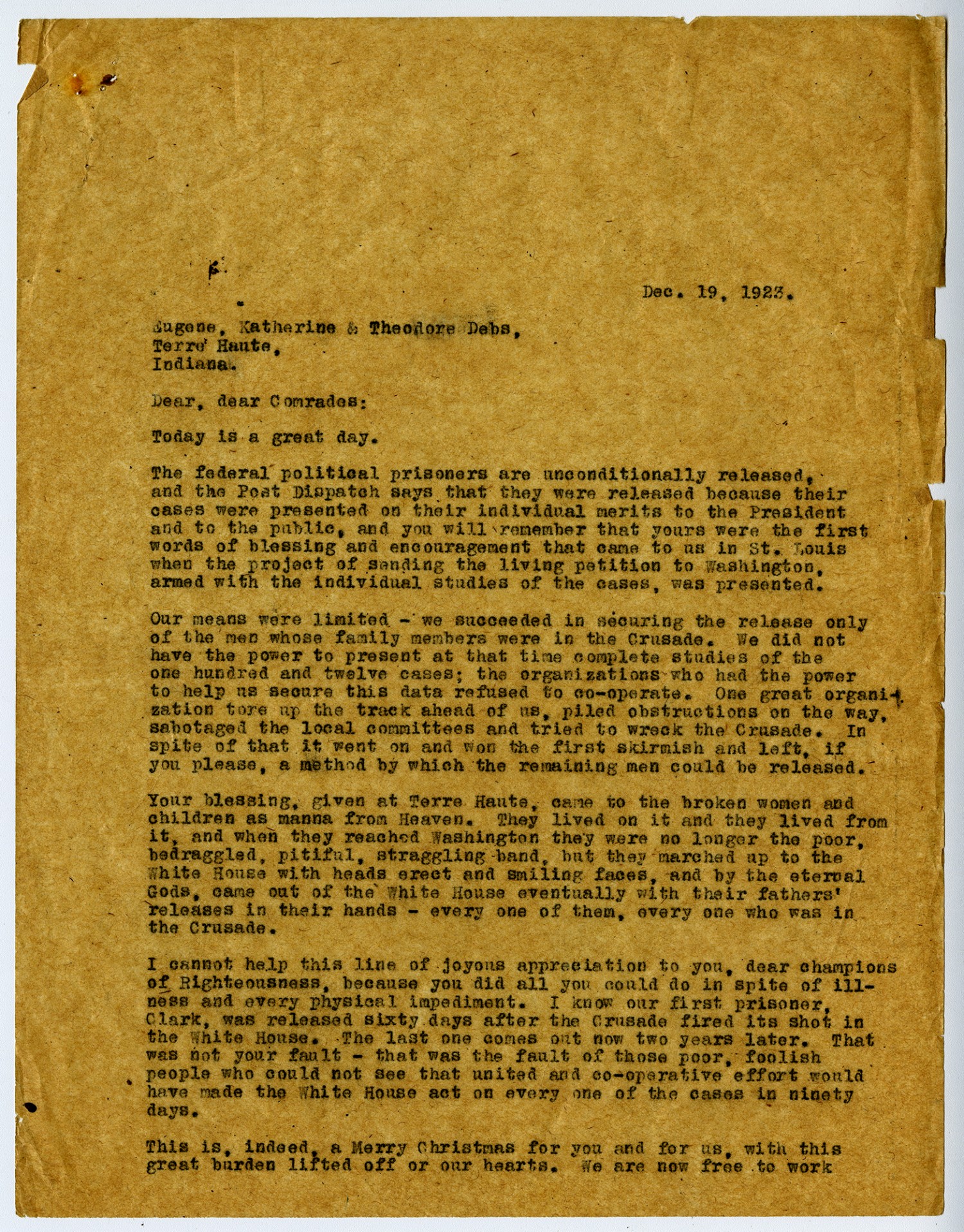 [December] 19, 1923. Eugene, Katherine &Theodore Debs, Terre Haute, Indiana. Dear, dear Comrades: Today is a great day. The federal political prisoners are unconditionally released, and the Post Dispatch says that they were released because their cases were presented on their individual merits to the President and to the public, and you will remember that yours were the first words of blessing and encouragement that came to us in St. Louis when the project of sending the living petition to Washington, armed with the individual studies of the cases, was presented. Our means were limited