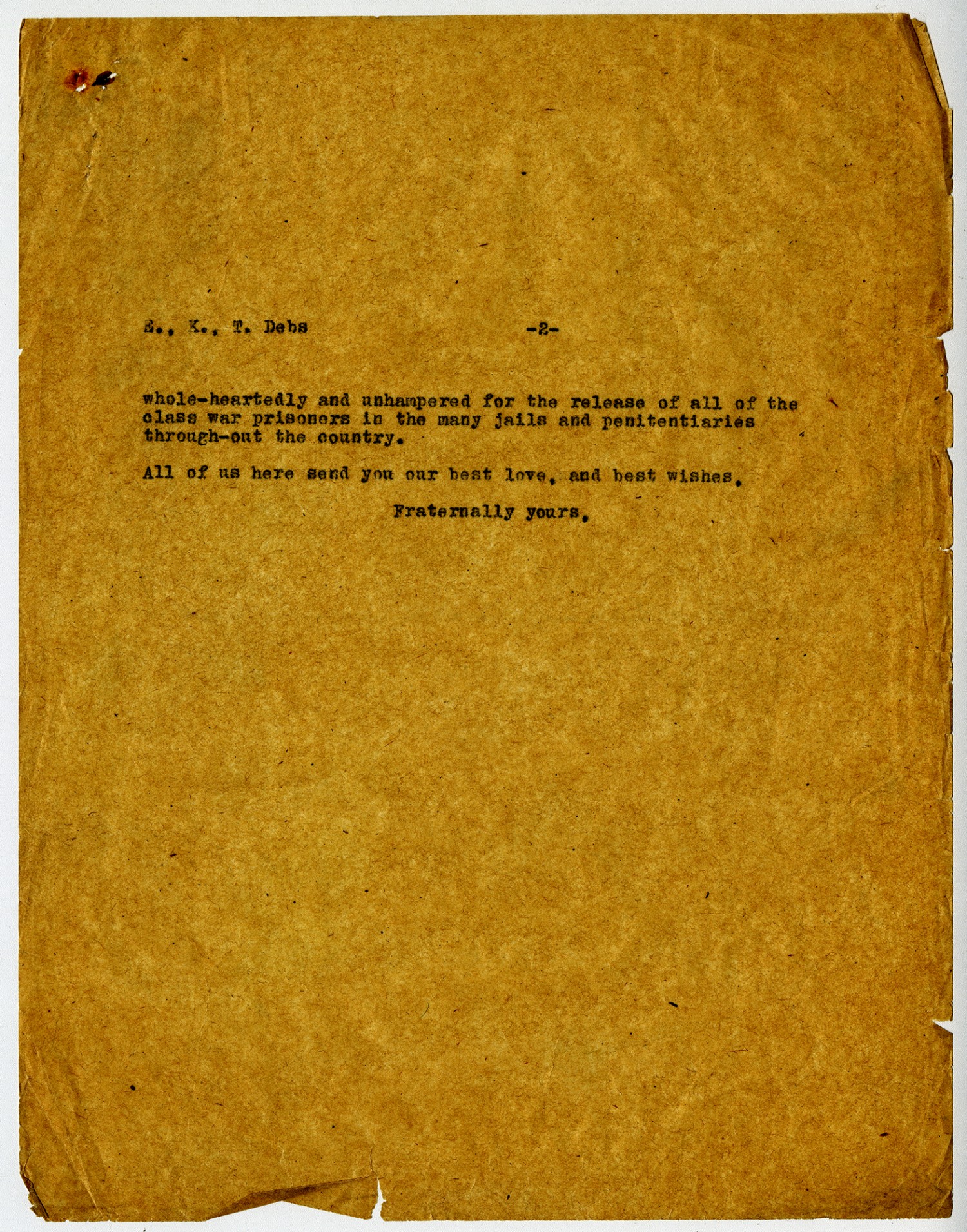 [page 2] E., K., T. Debs whole-heartedly and unhampered for the release of all of the class war prisoners in the many jails and penitentiaries through-out the country. All of us here send you our best love, and best wishes, Fraternally yours,