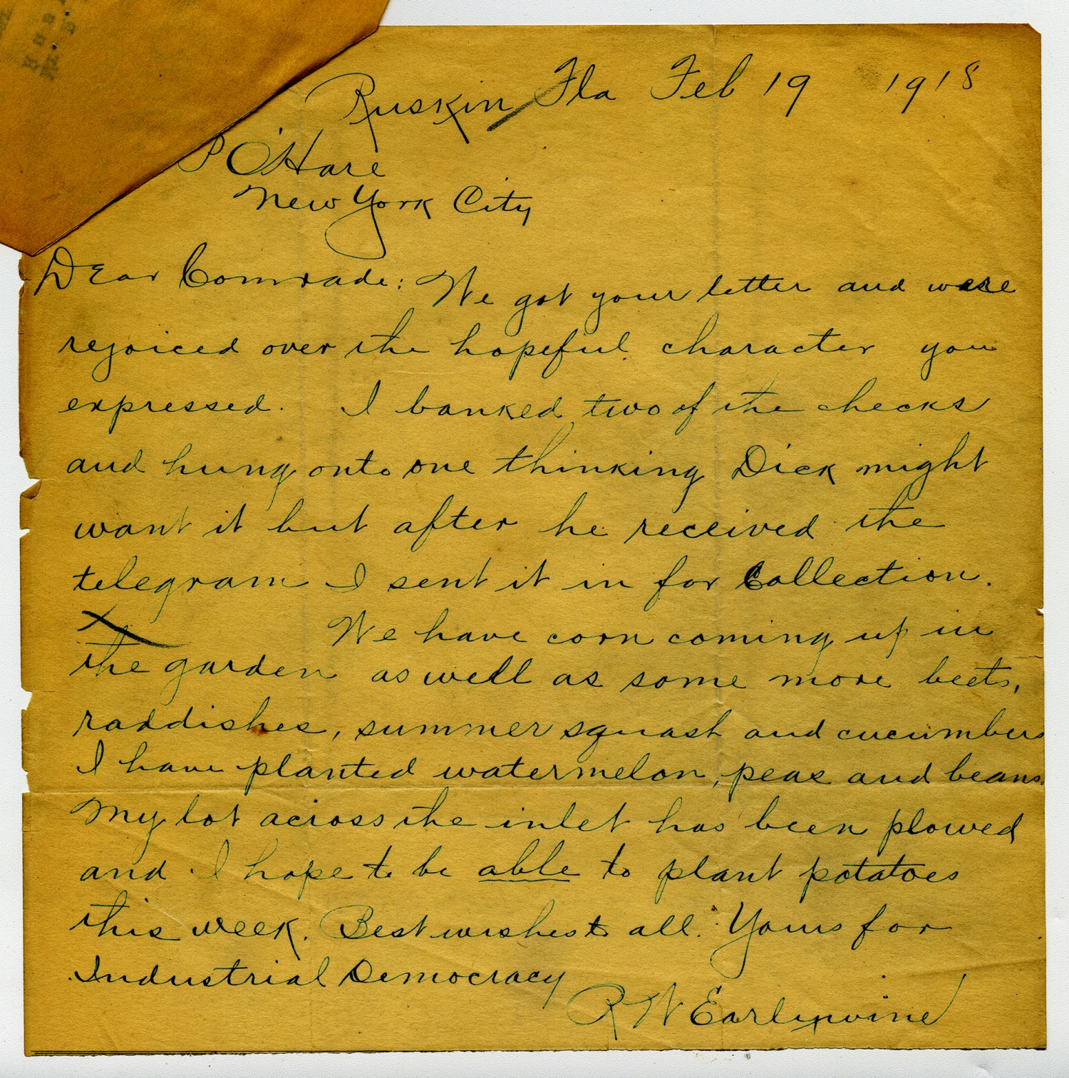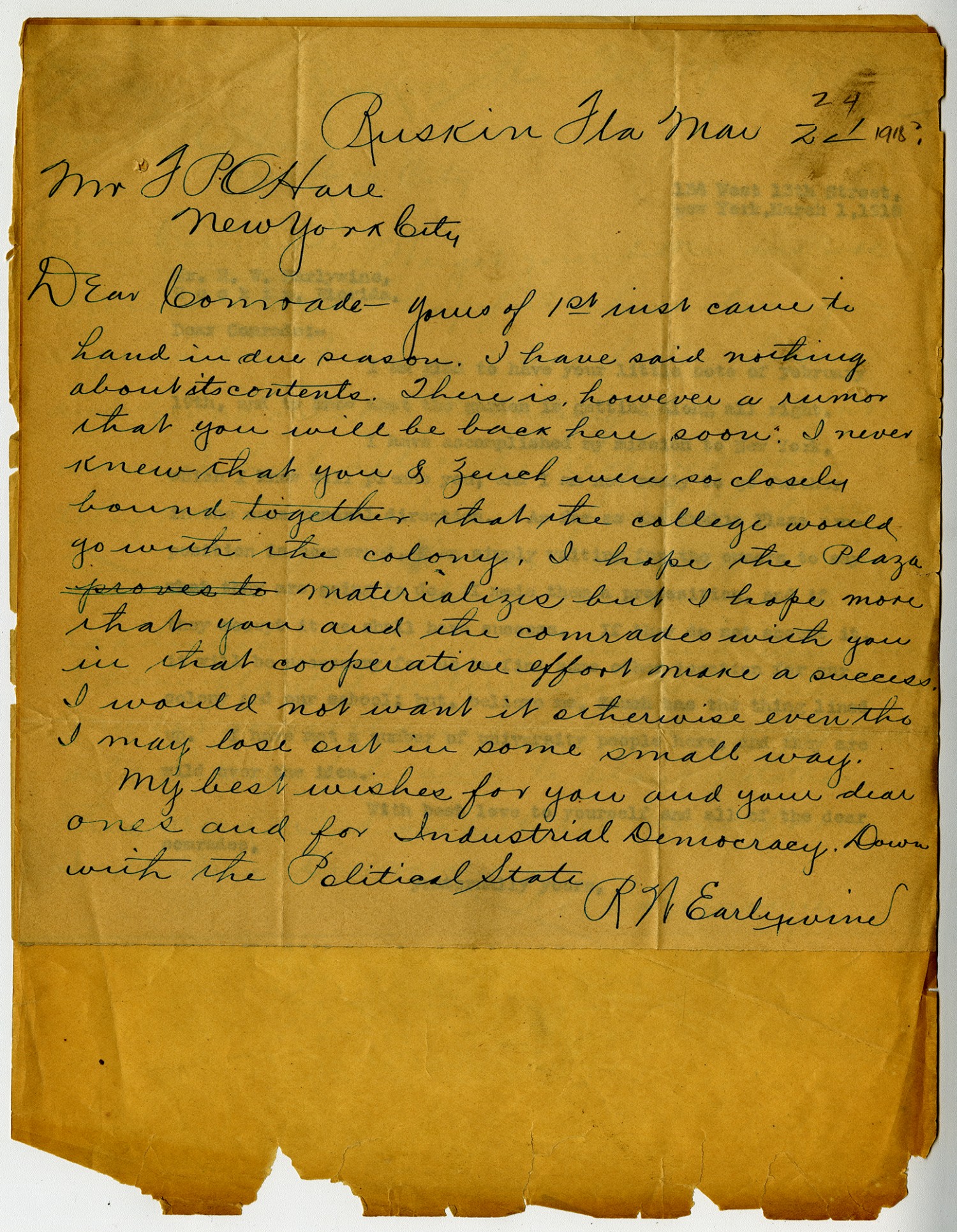 138 West 13th Street, New York, March 1, 1918 Mr. R.W. Earlywine, Ruskin, Florida Dear Commander:- I am glad to have your little note of February 19th, and to know that the garden is getting along all right. I have accomplished my mission to New York which I know will please you; and I am now ready to go further in the same general direction. As far as the Ruskin Plaza proposition is concerned. I am simply waiting to the owners to say what they are going to do. I made them a proposition, and if they accept it we shall have success. If they do not accept it, it will be necessary for us to find some other location for our colony and our school; but, believe me, Zeuch has the thing lined up. I have met a number of university people here, and they are wild over the idea. With best love to yourself and all of the dear comrades. Fraternally yours,