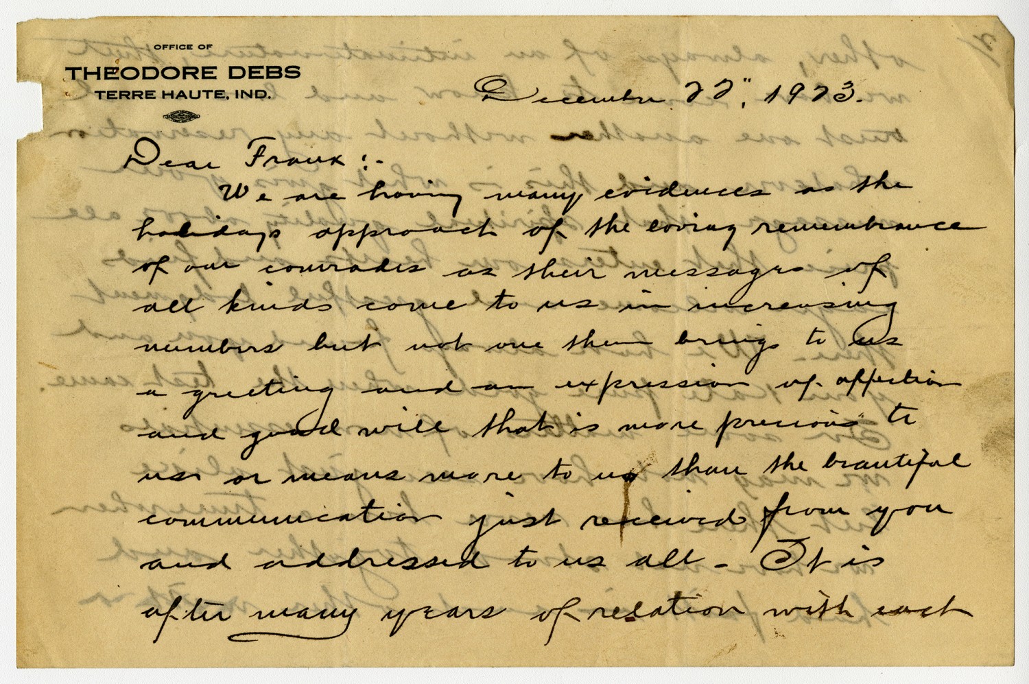 December 22, 1923 Dear Frank :- We are having many evidence as the holidays approach of the loving remembrance of our comrades as their messages of all kinds come to us in increasing numbers but not one of them brings to us a greeting and expression of affection and good will that is more precious to us or means more to us that the beautiful communication just received from you and addressed to us all. it is after many years of relation with each