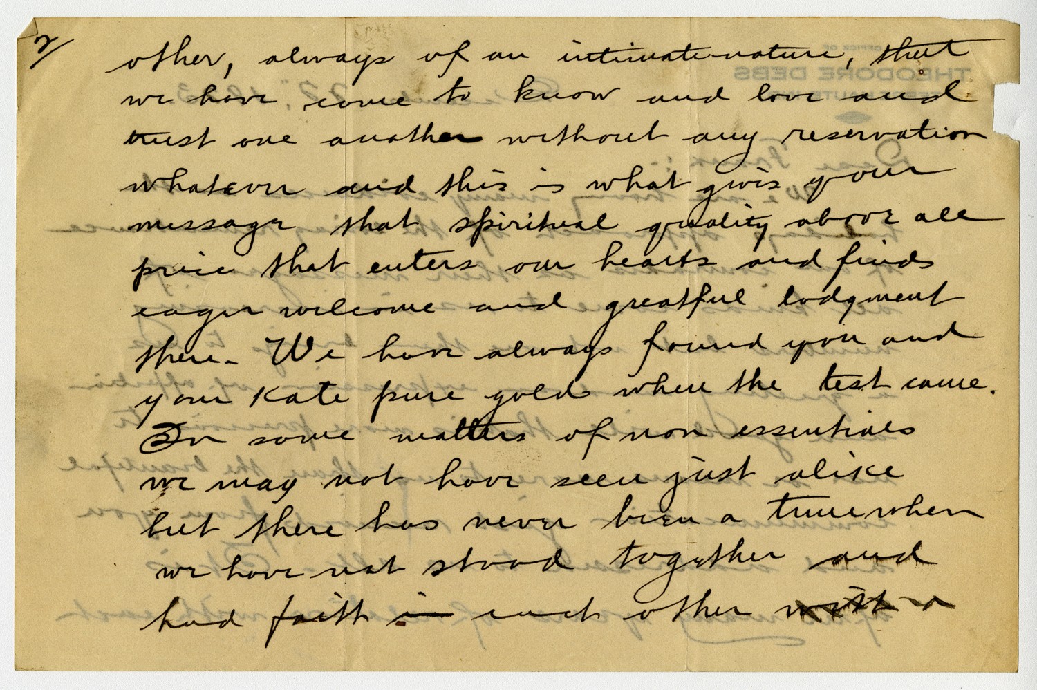 [page 2] other, always of an intimate nature, that we have come to know and love and trust one another without any reservation whatever and this is what gives your message that spiritual quality above all price that enters our hearts and finds eager welcome and grateful lodgment there. We have always found you and your Kate pure gold where the test came. In some matters of non essentials we may not have seen just alike but there has never been a time when we have not stood together and had faith in each other