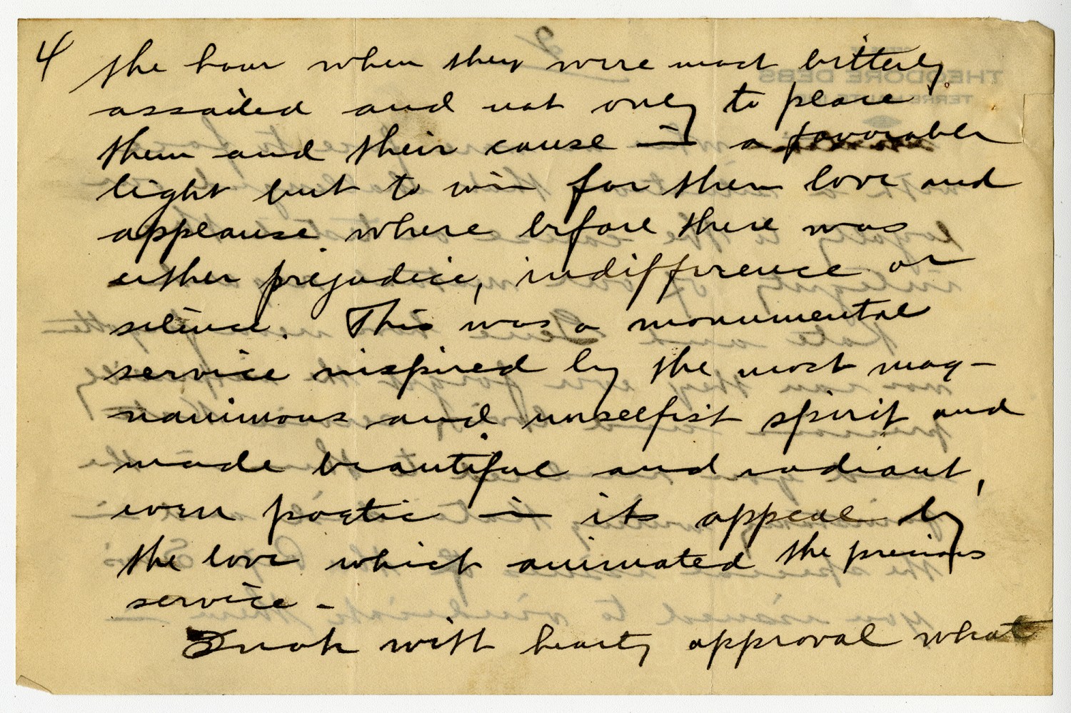 [page 4] in the hour when they were most bitterly assailed and not only to place them and their cause in a favorable light but to win for them love and applause where before there was either prejudice, indifference or silence. This was a monumental service inspired by the most magnanimous and unselfish spirit and made beautiful and radiant, even poetic in its appeal by the love which animated the precious service. I note with hearty approval what