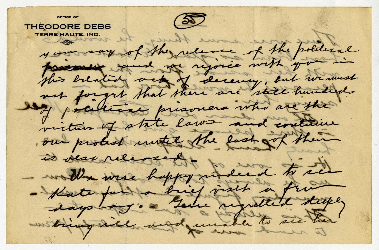 [page 5] you say of the release of the political prisoners and we rejoice with you in this belated act of decency, but we must not forget that there are still hundreds of political prisoners who are the victims of state laws and continue our protest until the last of them is also released. We were happy indeed to see Kate for a brief visit a few days ago. Gene regretted deeply being ill and unable to see her.