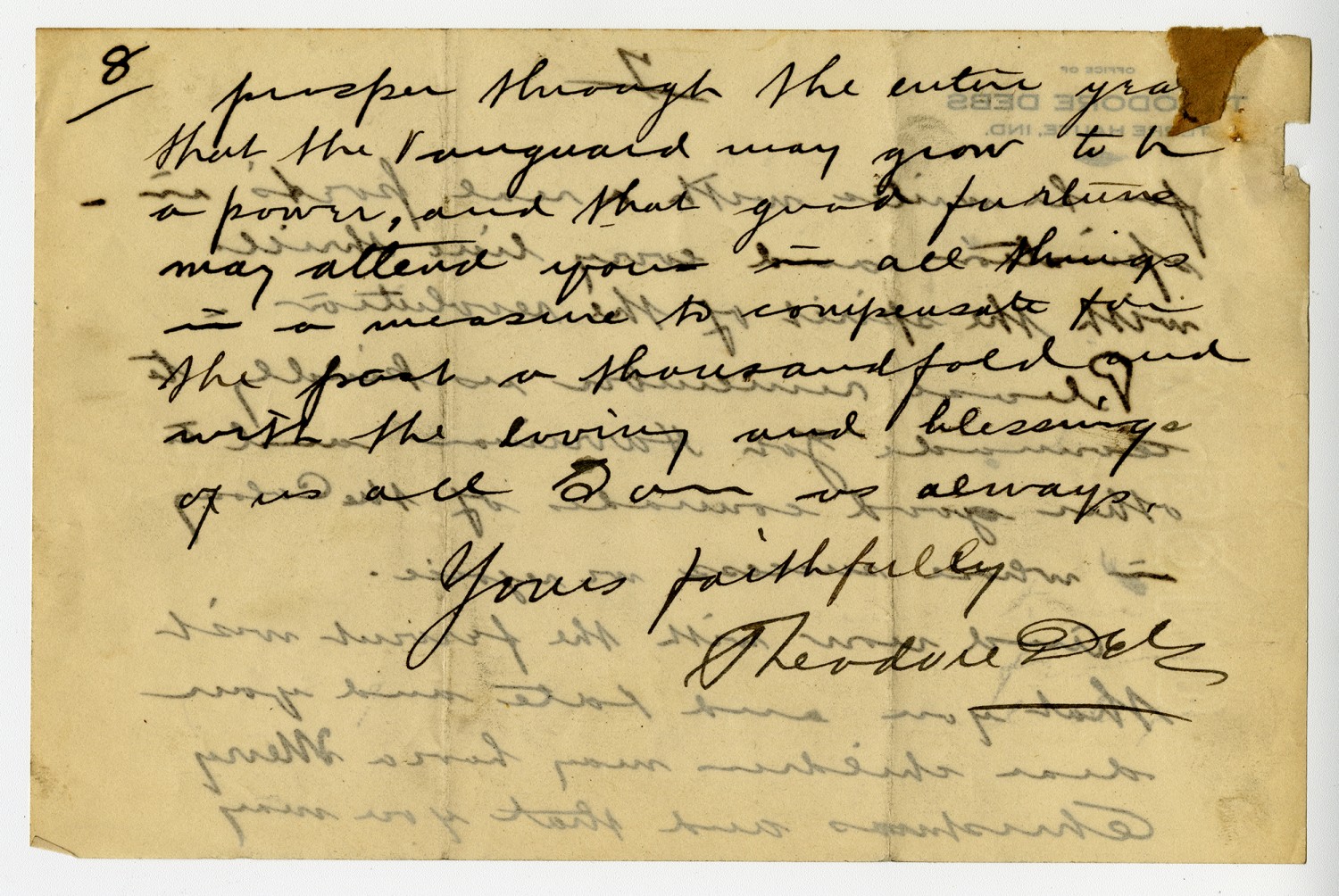 prosper through the entire year, that the Vanguard may grow to be a power, and that good fortune may attend you in all things in a measure to compensate for the past a thousand fold and with the loving and blessings of us all, I am as always, Yours faithfully, (Signed) Theodore Debs.
