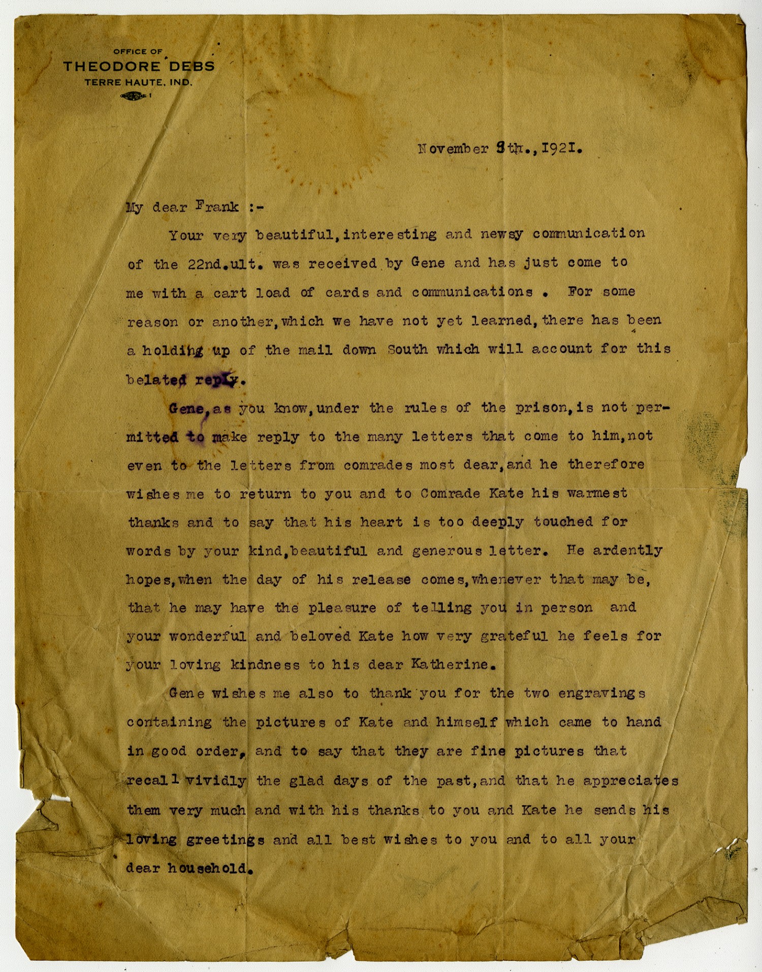 November 9th, 1921. My dear Frank :- Your very beautiful, interesting and newsy communication of the 22nd. ult. was received by Gene and has just come to me with a cart load of cards and communications . For some reason or another, which we have not yet learned, there has been a holding up of the mail down South which will account for this belated reply. Gene, as you know, under the rules of the prison, is not permitted to make reply to the many letters that come to him, not even the letter from comrades most dear, and he therefore wishes me to return to you and to Comrade Kate his warmest thanks to say that his heart is too deeply touched for words by your kind, beautiful and generous letter, He ardently hopes, when the day of his release comes, whenever that may be, that he may have the pleasure of telling you in person and your wonderful and beloved Kate how very grateful he feels for your loving kindness to his dear Katherine. Gene wishes me also to thank you for the two engravings containing the pictures of Kate and himself which came to hand in good order, and to say that they are fine pictures that recall vividly the glad days of the past, and that he appreciates them very much and with his thanks to you and Kate he sends his loving greetings and all best wishes to you and to all your dear household.