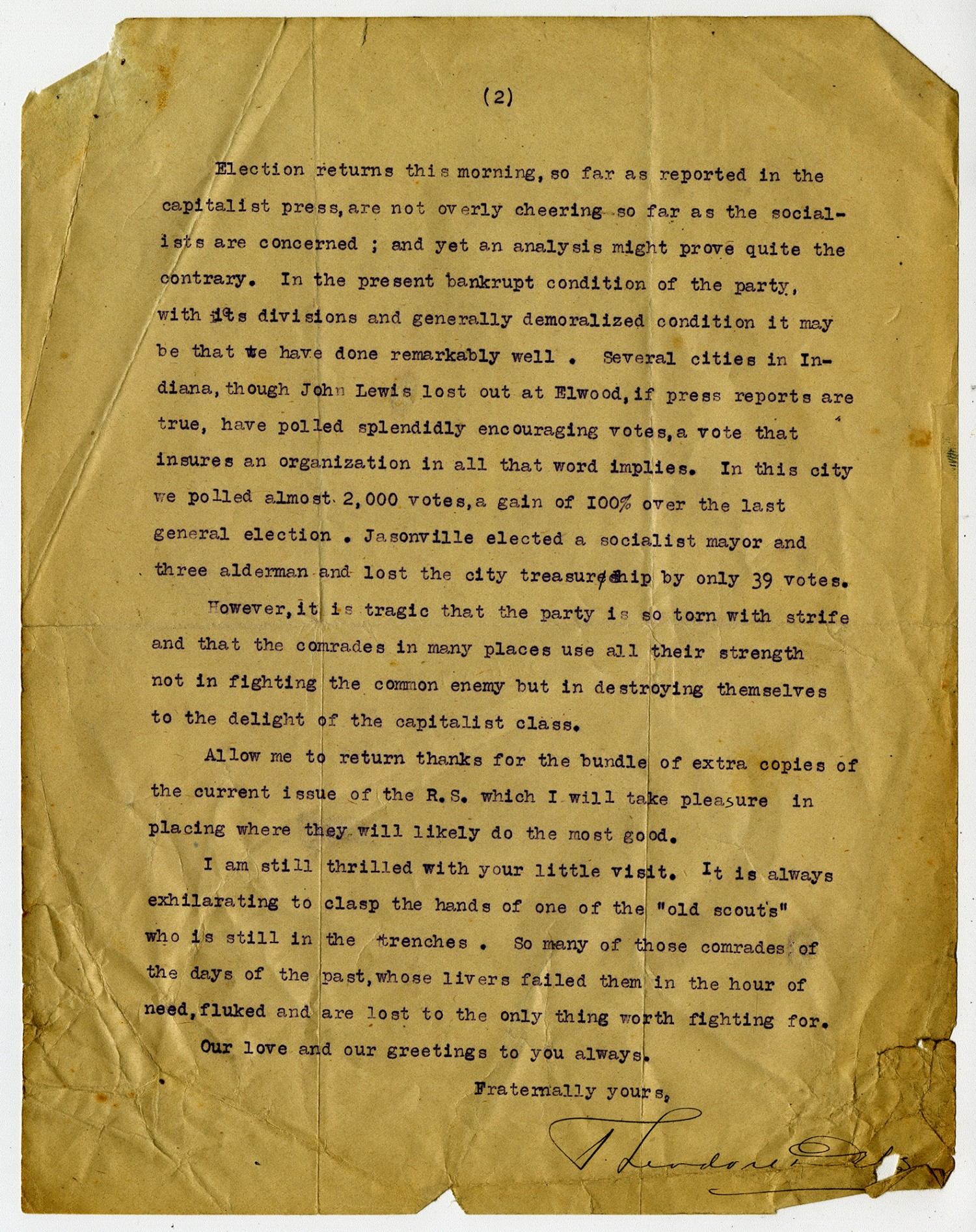 [page 2] Election returns this morning, so far as reported in the capitalist press, are not overly cheering so far as the socialists are concerned ; and yet an analysis might prove quite the contrary. In the present bankrupt condition of the party, with its divisions and generally demoralized condition it may be that we have done remarkably well. Several cities in Indiana, though John Lewis lost out at Elwood, if press reports are true, have polled splendidly encouraging votes, a vote that insures an organization in all that word implies. In this city we polled almost 2,000 votes, a gain of 100% over the last general election. Jasonville elected a socialist mayor and three alderman and lost the city treasureship by only 39 votes. However, it is tragic that the party is so torn with strife and that the comrades in many places use all their strength not in fighting the common enemy but in destroying themselves to the delight of the capitalist class. Allow me to return thanks for the bundle of extra copies of the current issue of the R.S. which I will take pleasure in placing where they will likely do the most good. I am still thrilled with your little visit. It is always exhilarating to clasp the hands of one of the