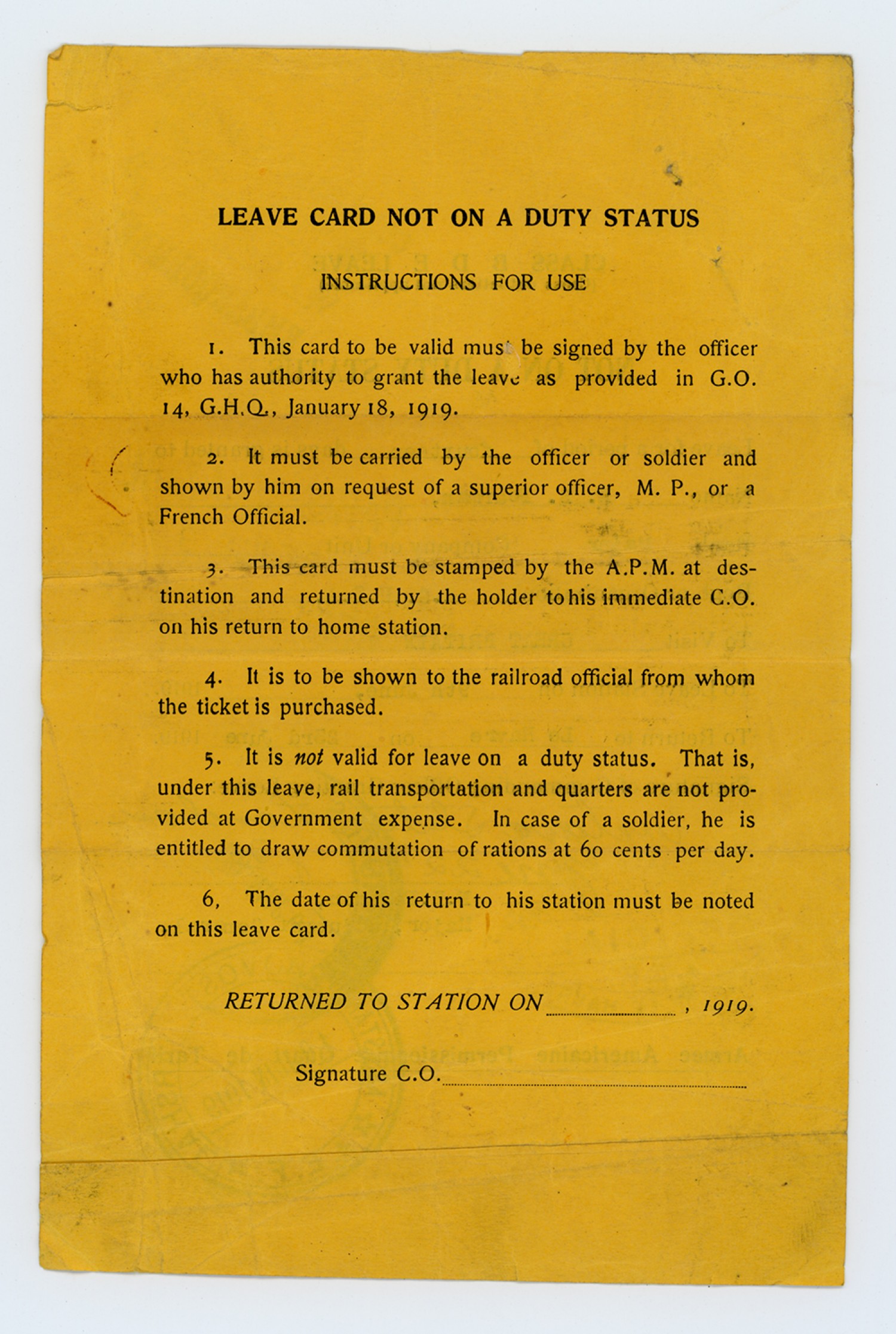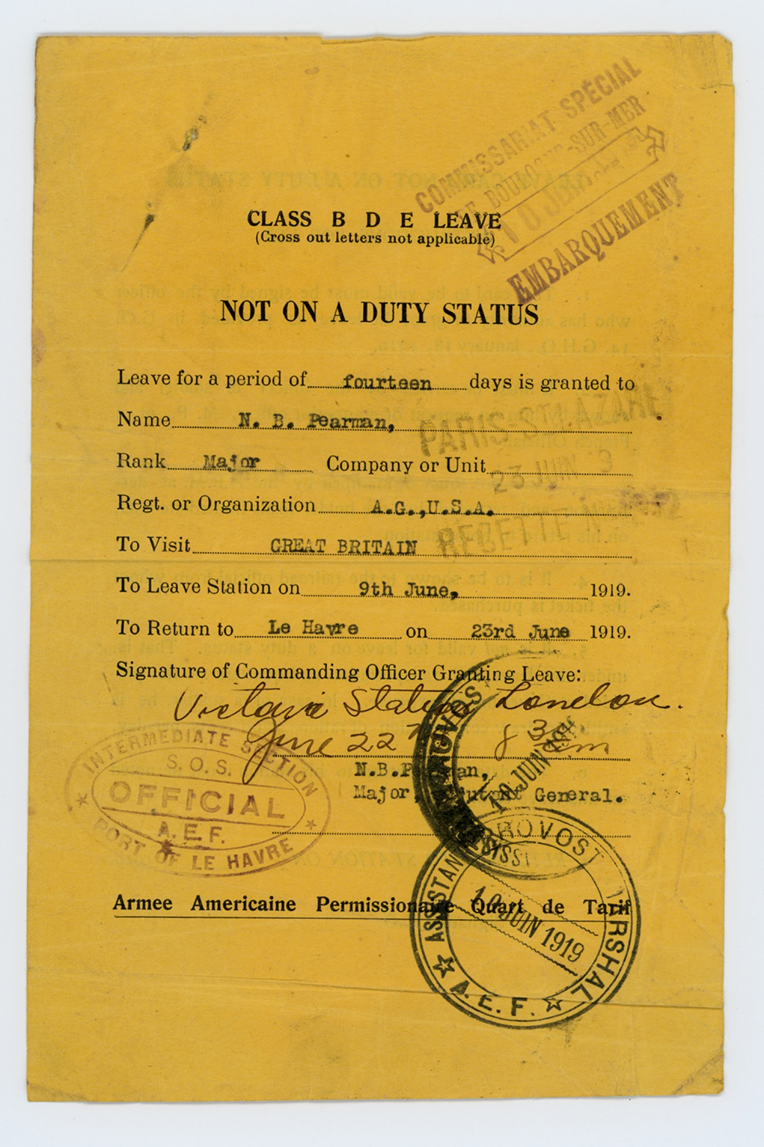 | Description | <p>A card requesting leave from duty for Norman B. Pearman – June 9, 1919</p> |
