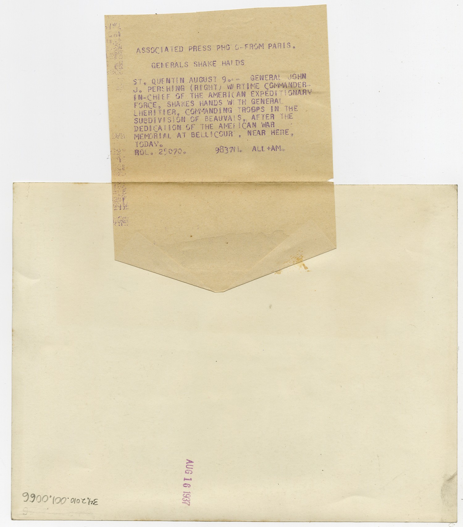 ASSOCIATED PRESS PHOTO - FROM PARIS. GENERALS SHAKE HANDS ST. QUENTIN AUGUST 9, -- GENERAL JOHN J. PERSHING (RIGHT) WARTIME COMMANDER-IN-CHIEF OF THE AMERICAN EXPEDITIONARY FORCE, SHAKES HANDS WITH GENERAL LHERITIER, COMMANDING TROOPS IN THE SUBDIVISION OF BEAUVALS, AFTER THE DEDICATION OF THE AMERICAN WAR MEMORIAL AT BELLICOURT, NEAR HERE, TODAY. ROL. 25070. 983711. AL AM.