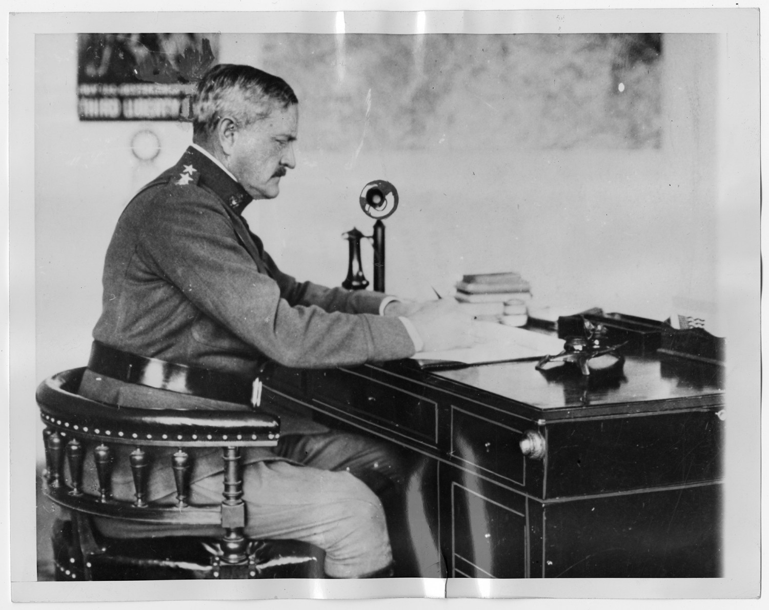 | Description | Photograph of General John J. Pershing sitting at a desk at his General Headquarters in France. Pershing, a Laclede, Missouri native, led the American Expeditionary Forces in World War I. |