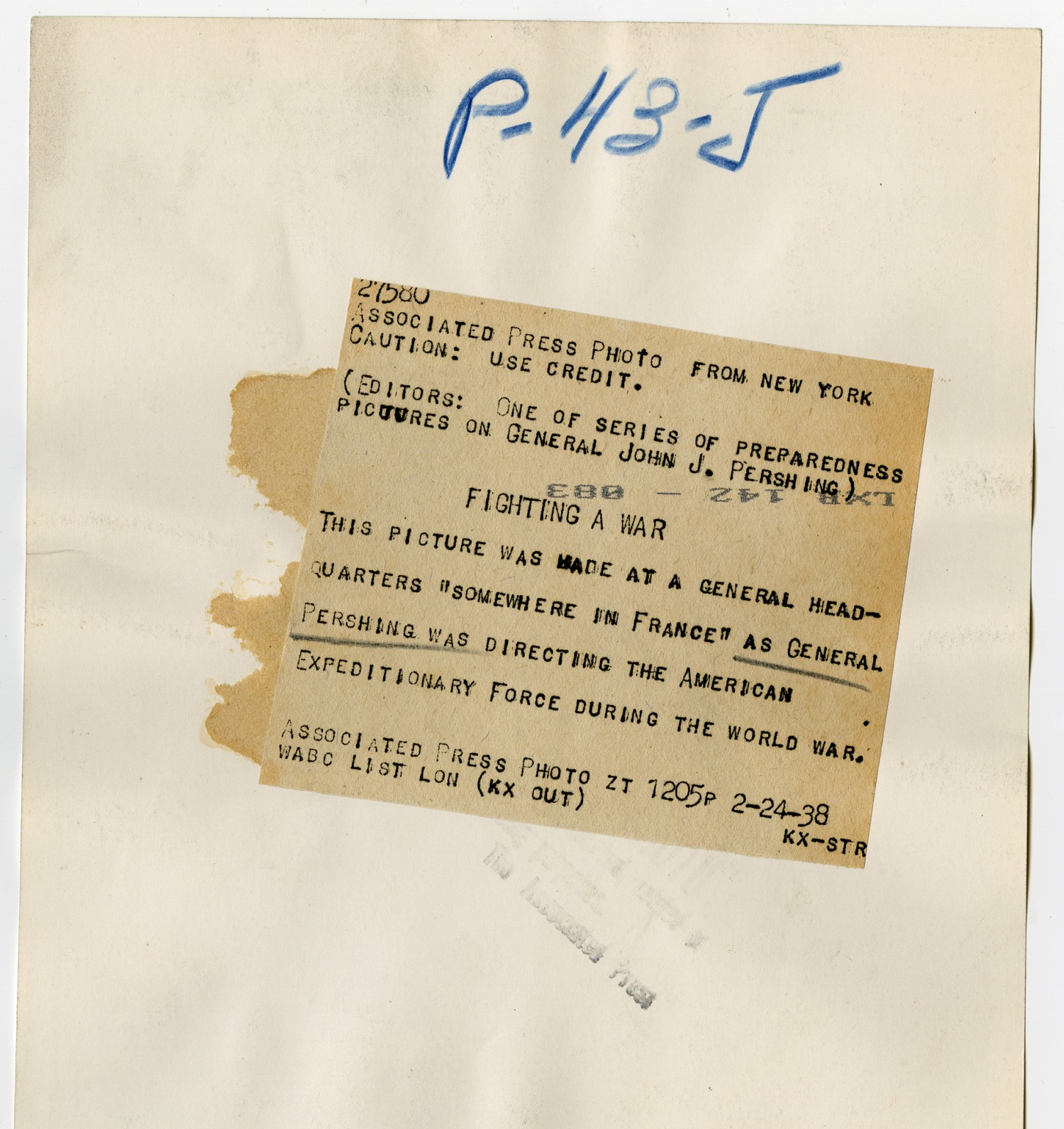 | Source | Associated Press. Photograph of John J. Pershing at General Headquarters in France. n.d. John J. Pershing Photograph Collection. General John J. Pershing Boyhood Home State Historic Site, P.O. Box 141, Laclede, MO 64651. |