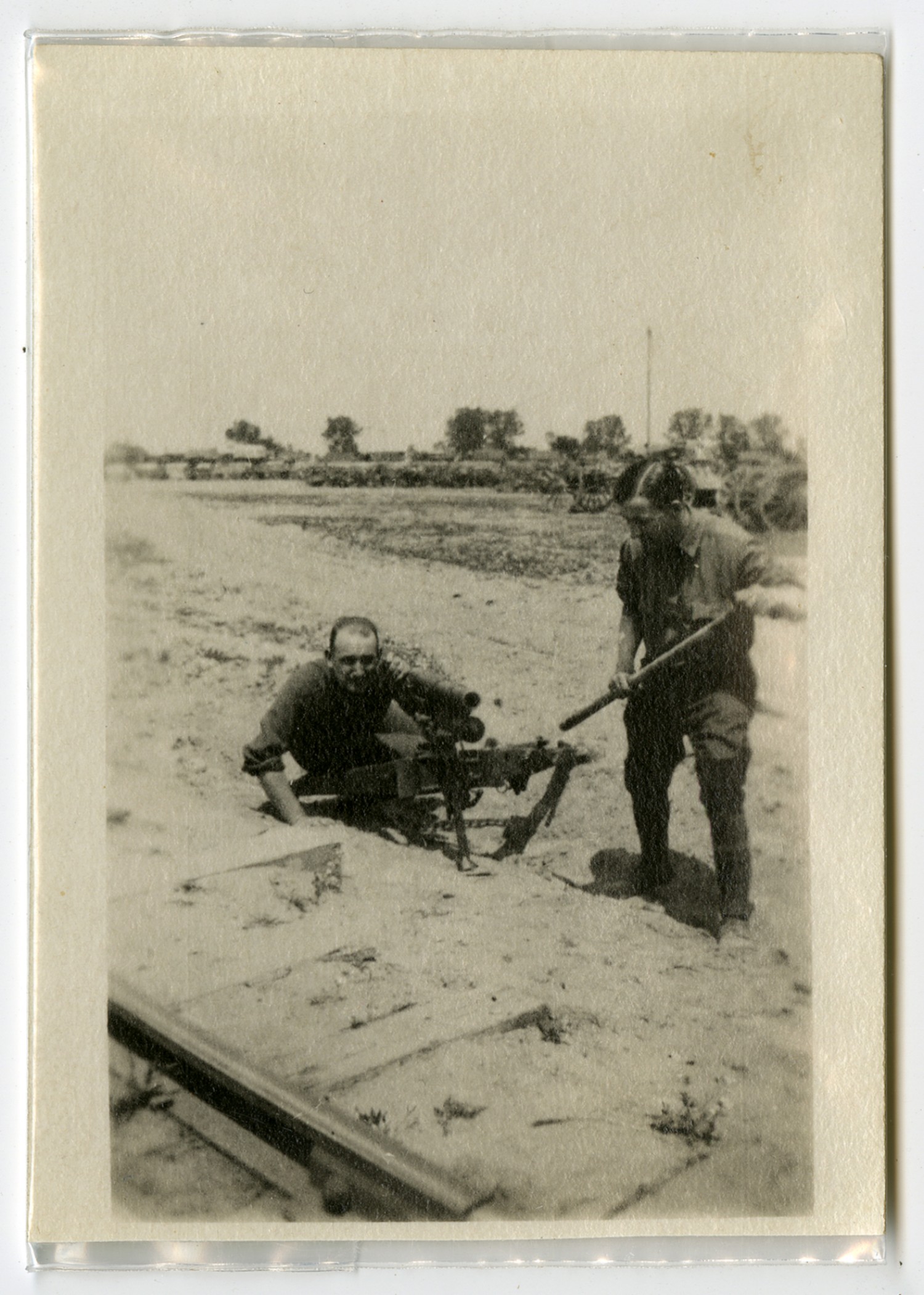 | Description | Photograph of two unidentified soldiers posing with a machine gun beside train tracks. |