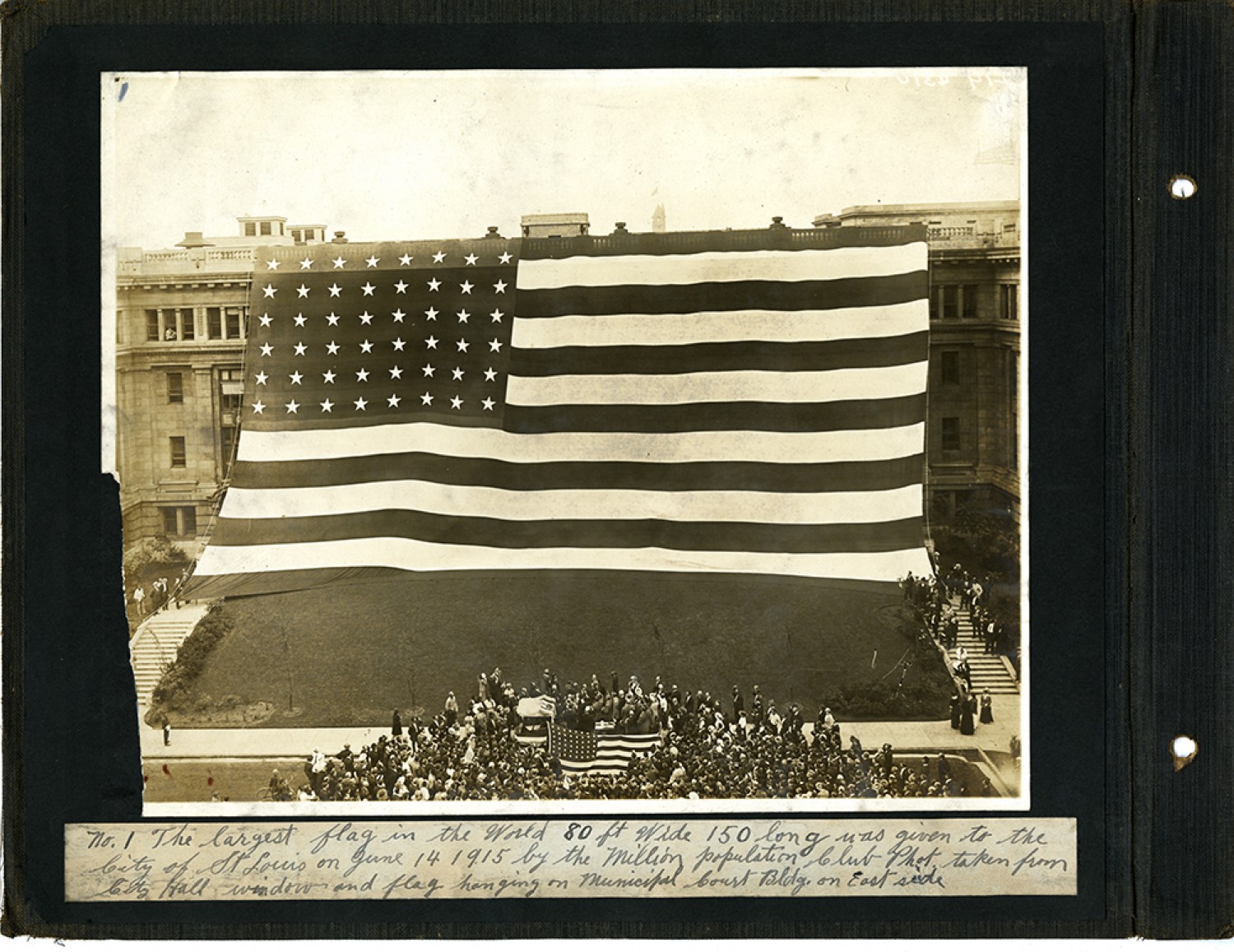 No. 1 The largest flag in the World 80 ft Wide 150 long was given to the City of St Louis on June 14 1915 by the Million population Club Phot taken from City Hall window and lfag hanging on Municipal Court Bldg. on East side
