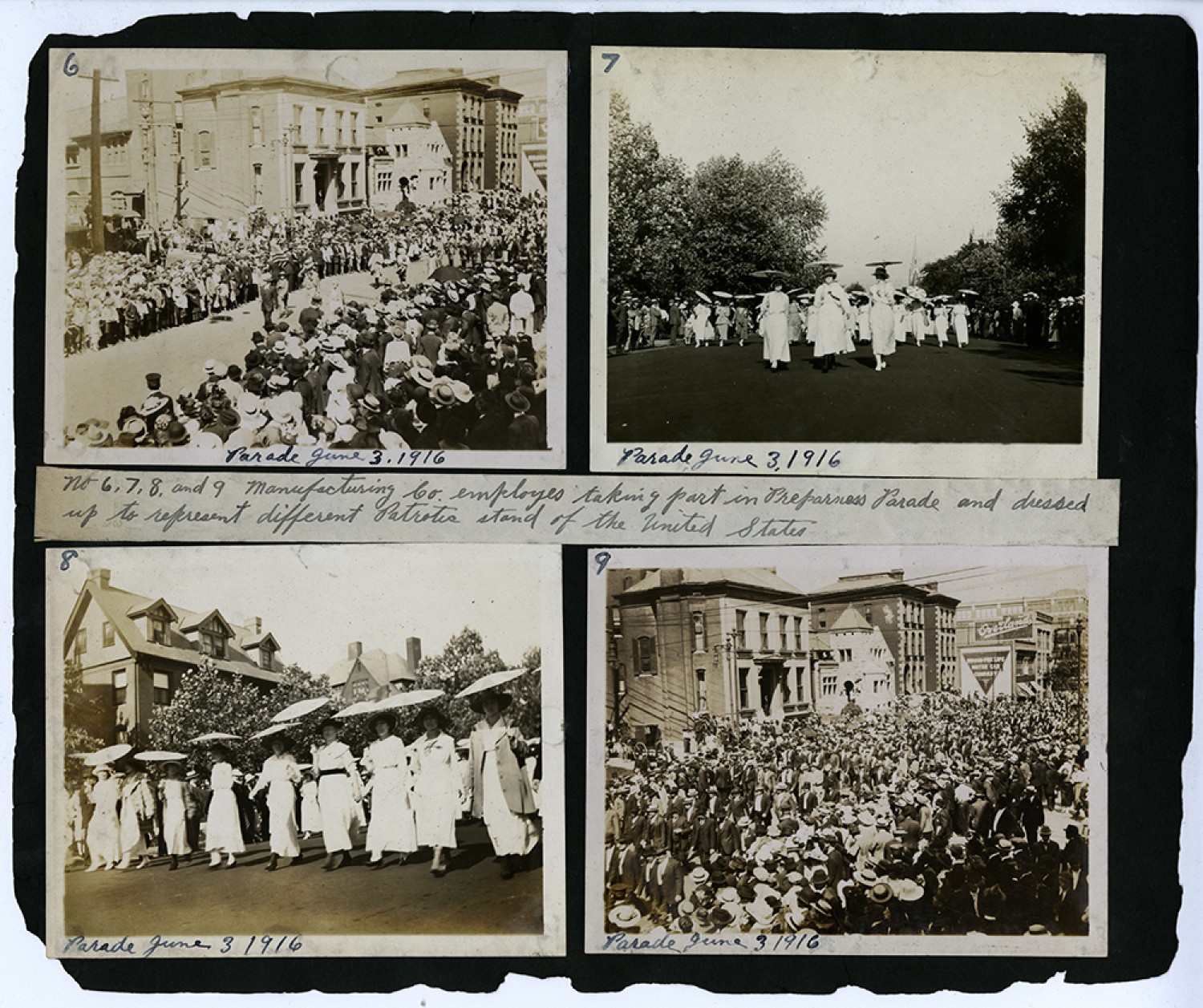 No 6, 7, 8, and 9 Manufacturing Co. employes taking part in Preparness Parade and dressed up to represent different patriotic stand of the United States