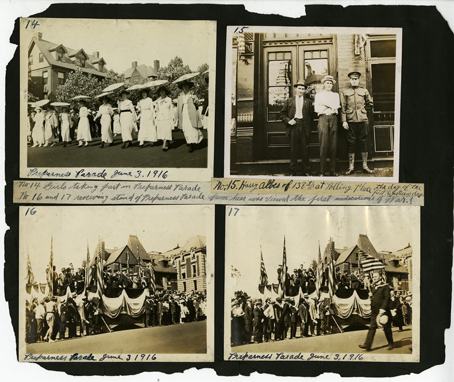 No 14 Girls taking part in Preparness Parade No. 15. Harry Albes of 138th at Polling Place the day of the first Registering day No 16 and 17 revewing stand of Preparness Parade from hear was viewed the first indications of war.?
