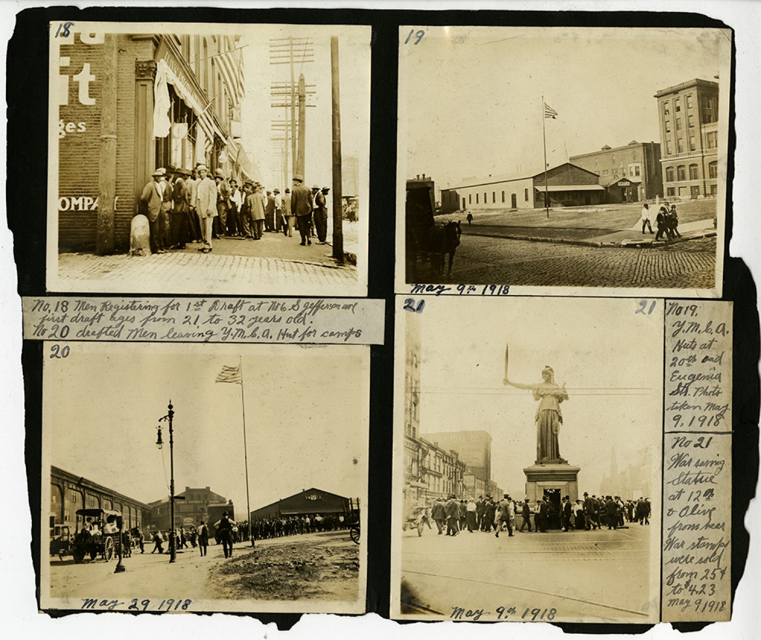 No. 18 Men Registering for 1st Draft at No 6 S Jefferson Ave first draft ages from 21 to 32 years old. No 20 drafted men leaving Y.M.C.A. Hut for camps No 19. Y.M.C.A. Huts at 20th and Eugenia Str. Photo taken May 9, 1918 No 21 War serving Statue at 12th & Olive from hear War Stamps were sold from 25¢ to $4.23 May 9 1918