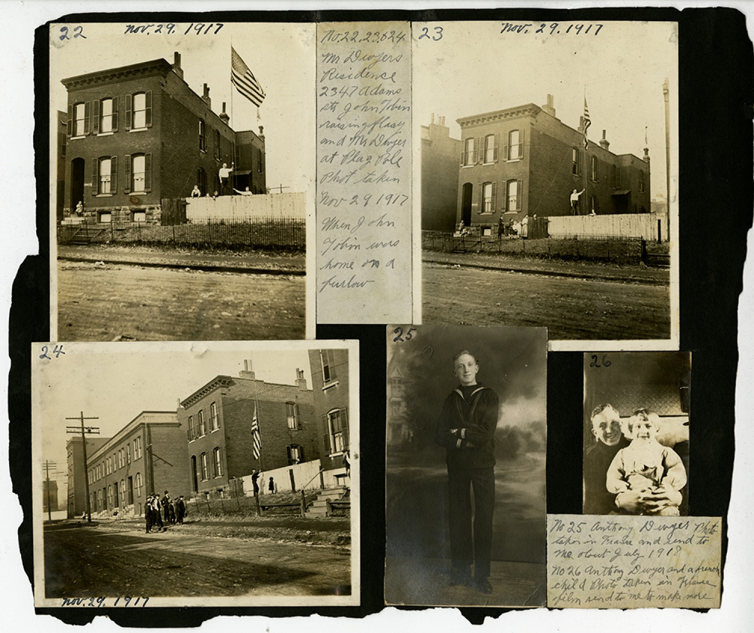 No. 22, 23, & 24 Mr Dwyers Residence 2347 Adams str John Tobin raising flag and Mr Dwyer at Flag Pole Pho taken [November] 29 1917 When John Robin was home on a furlow No 25 Anthony Dwyer Photo taken in France and send to me about July 1918 No 26 Anthony Dwyer and a French child Photo taken in France Film sent to me to make more