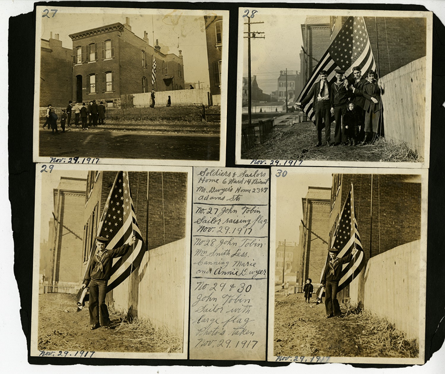 Soldiers & Sailors home 6 Ward 14 Pricent Mr. Dwyer’s Home 2347 Adams Str No. 27 John Tobin Sailor raising flag [November] 29, 1917 No 28 John Tobin Wm Smith Less Canning Marie and Annie Dwyer No 29 & 30 John Tobin Sailor with large flag Photo’s taken [November] 29, 1917