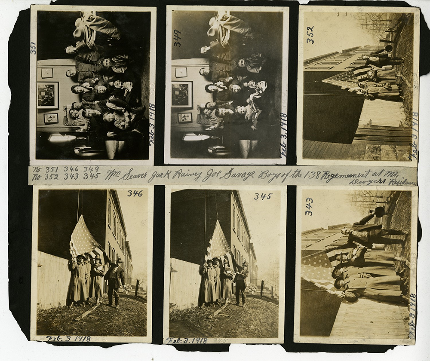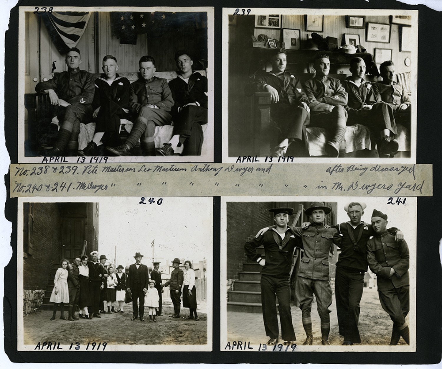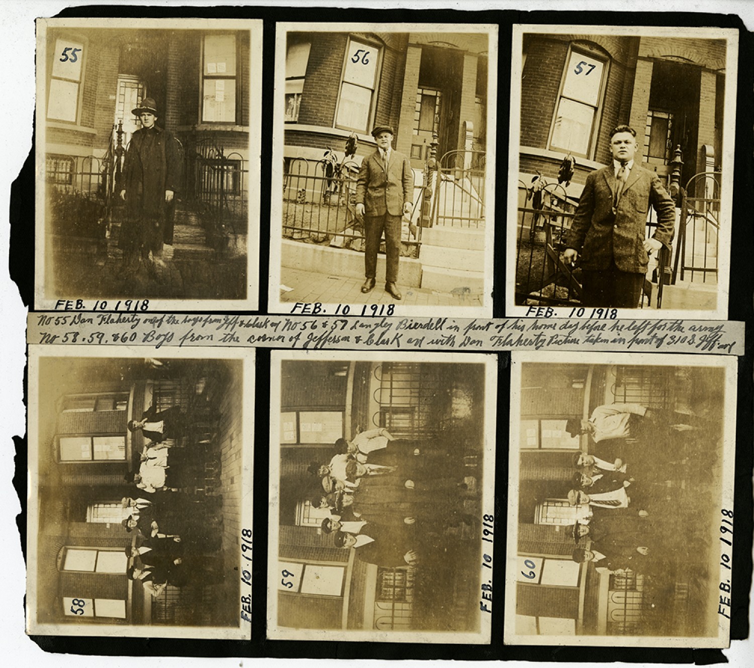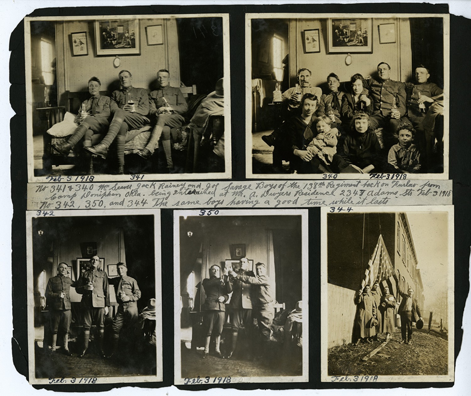No 341 &340 Wm Seaver, Jack Rainey and Joe Savage Boys of the 138th Regiment back on Furlow from Camp Doniphan [Oklahoma] being enterained at Mr A. Dwyers Residence 2348 Adams Str Feb 3 1918 No 342, 350, and 344 The same boys having a good time while it lasts