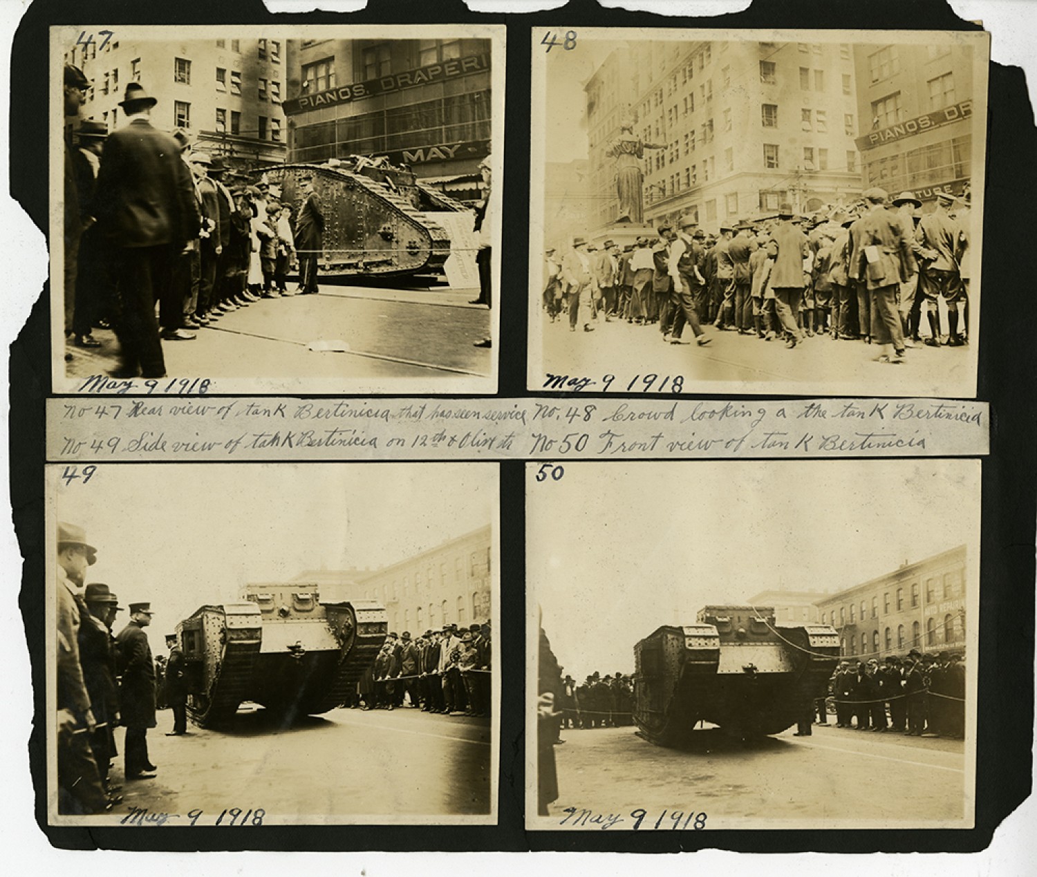 No 47 Rear view of tank Bertinicia that has seen service No. 48 Crowd looking a the tank Bertinicia No 49 Side view of tank Bertinicia on 12th & Olive str No 50 Front view of Tank Bertinicia
