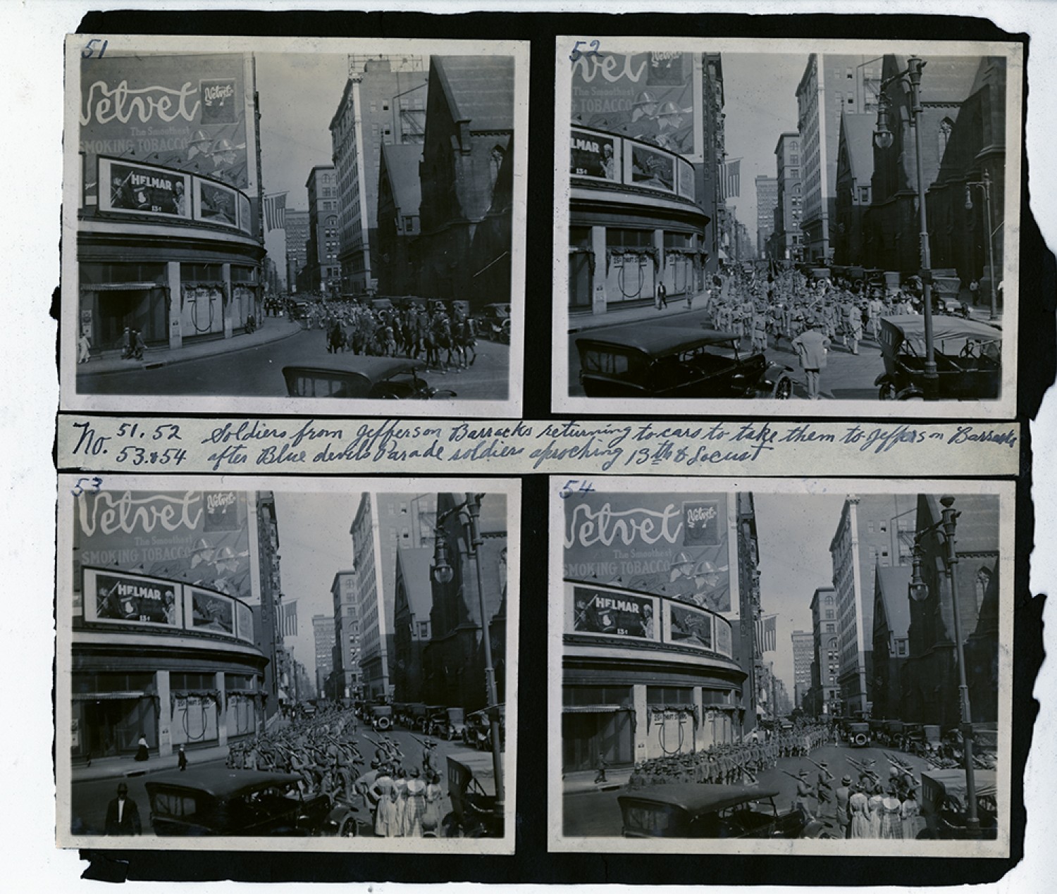 No. 51, 52 53, & 54 Soldiers from Jefferson Barracks returning to cars to take them to Jefferson Barracks after Blue devils Parade soldiers approaching 13th & Locust