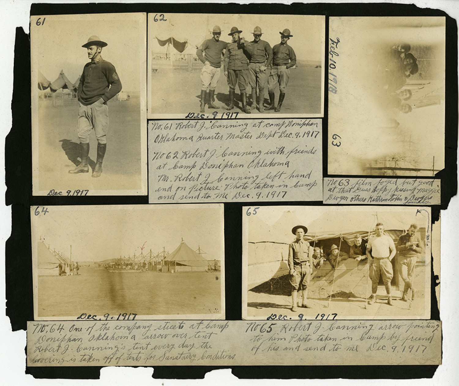 No. 61 Robert J. Canning at camp Doniphan Oklahoma Quarter Master Dept [December] 9, 1917 No 62 Robert J. Canning with friends at Camp Doniphan Oklahoma Mr. Robert J Canning left hand end on Picture Photo taken in Camp and send to me [December] 9, 1917 No 63 Film foged but good at that Guss Hoppy Kissing Maggie Dwyer others Kathrin Tobin & Dwyers family No. 64 One of the company streets at Camp Doniphan Oklahoma arrow over tent Robert J. Canning’s tent every day the Covering is taken off of tent for Sanatary Conditions No 65 Robert J. Canning arrow pointing to him Photo taken in Camp by friend of his and sent to me [December] 9, 1917