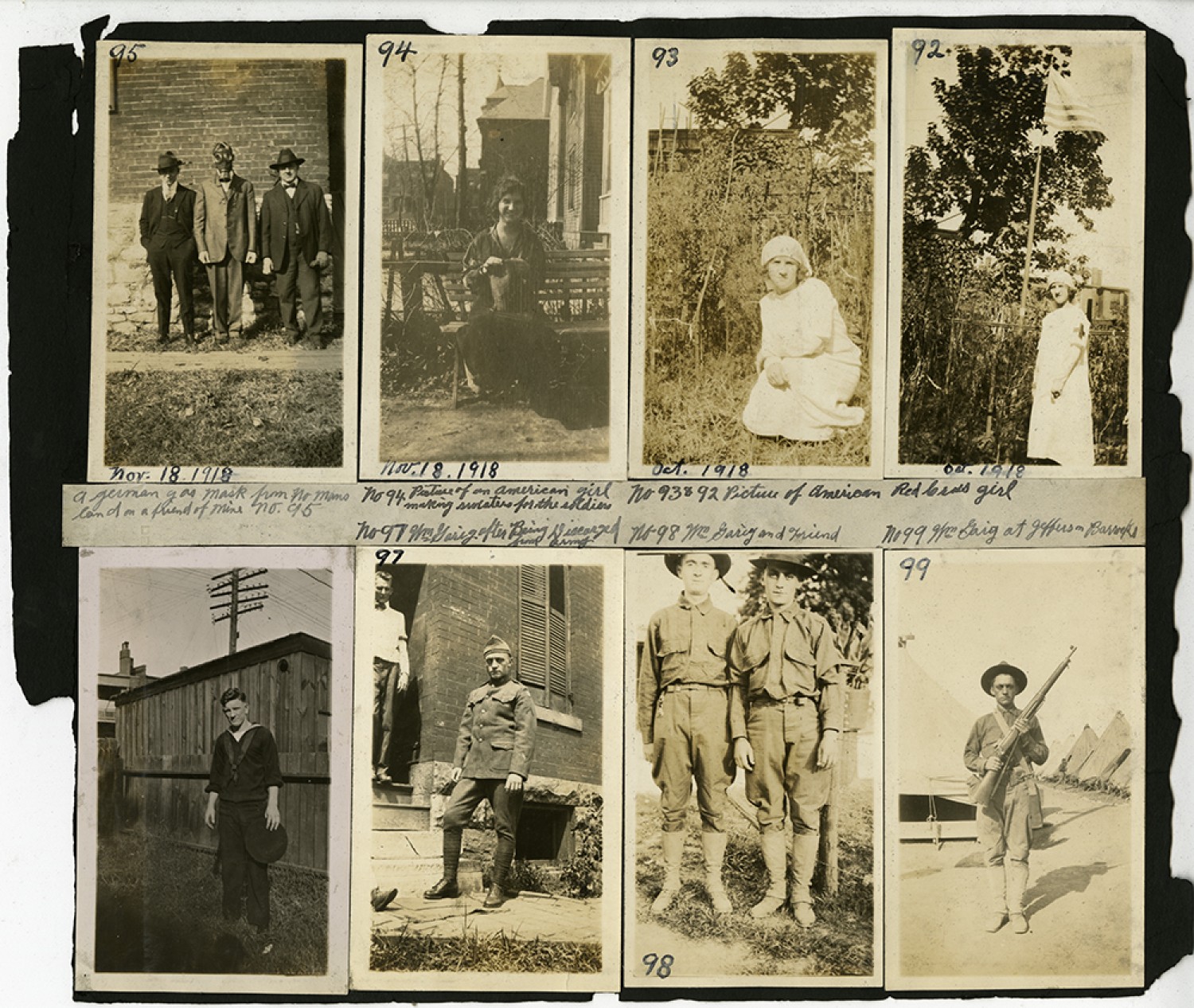 A german gas mask from No Mans land on a friend of Mine No. 95 No 94 Picture of an American girl making sweaters for the soldiers No 97 Wm Garig after being Discarged from army No 93 & 92 Picture of American Red Cross girl No 98 Wm Garig and Friend No 99 Wm Garig at Jefferson Barracks