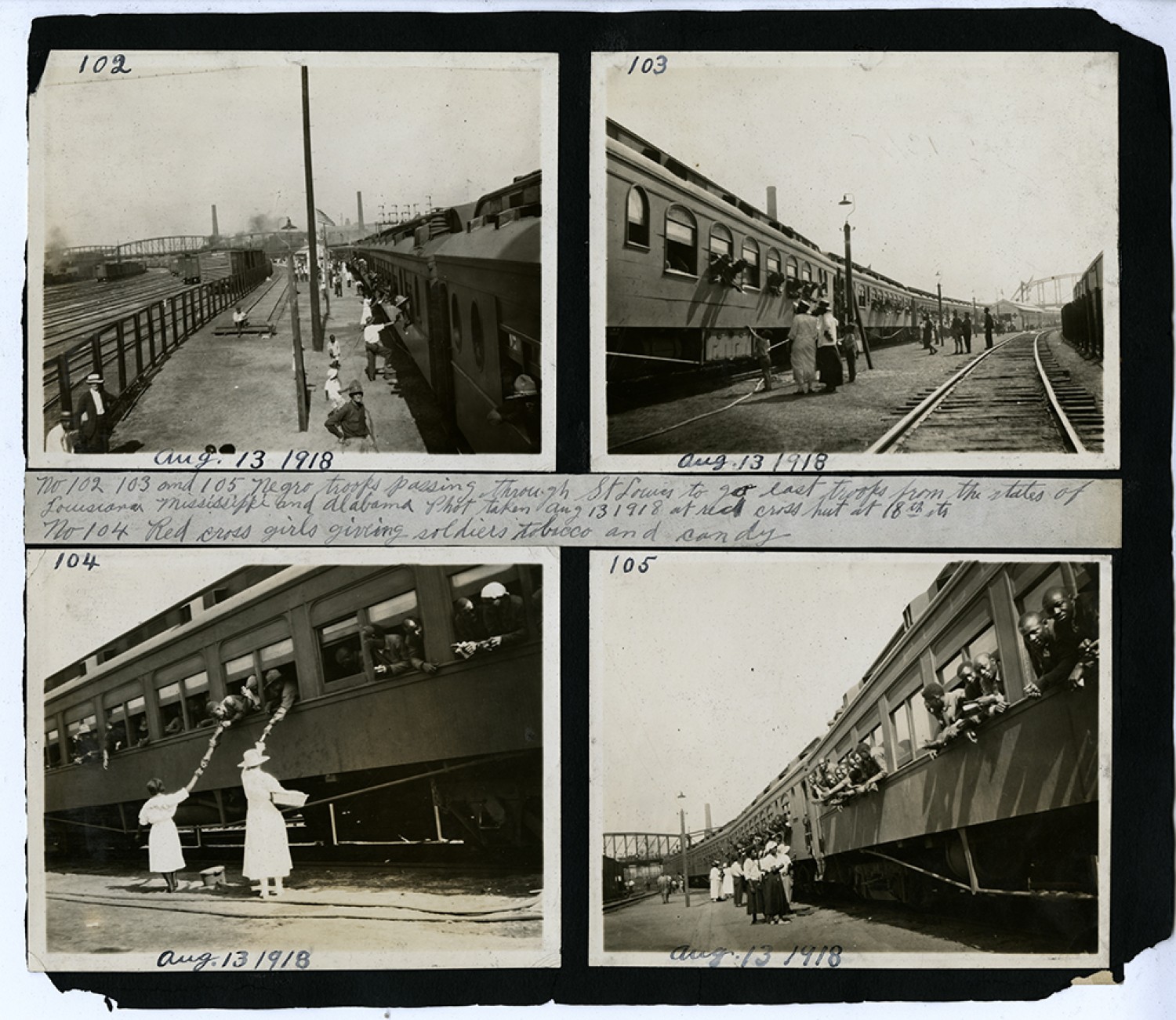 No 102 103 and 105 Negro troops passing through St Louis to go east troops from the states of Louisiana Mississippi and Alabama [Photo] taken [August] 13 1918 at red cross hut at 18th str No 104 red cross girls giving soldiers tobacco and candy