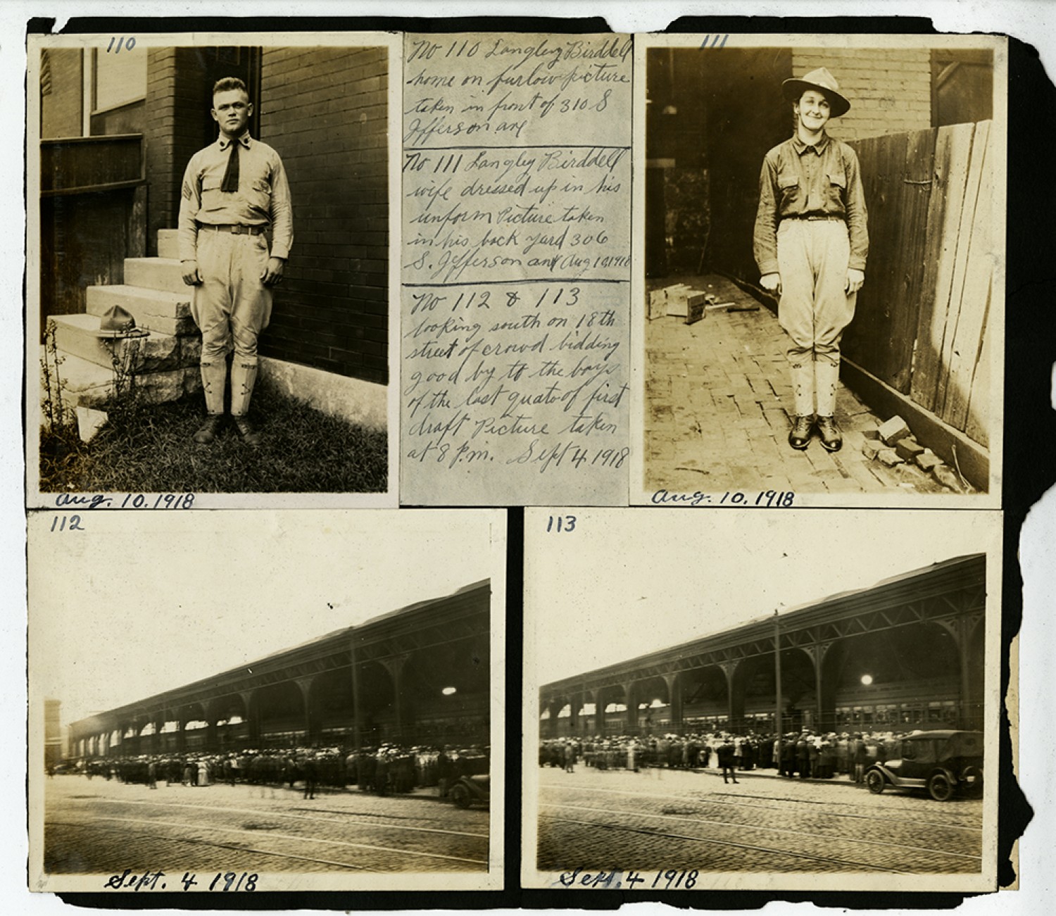 No 110 Langley Birddell home on furlow picture taken in front of 310 S Jefferson ave No 111 Langley Birddell wife dressed up in his uniform Picture taken in his back yard 306 S. Jefferson ave [August] 10, 1918 No 112 & 113 looking south on 18th street of crowd bidding good by to the boys of the last quato of first draft picture taken at 8 p.m. [September] 4 1918