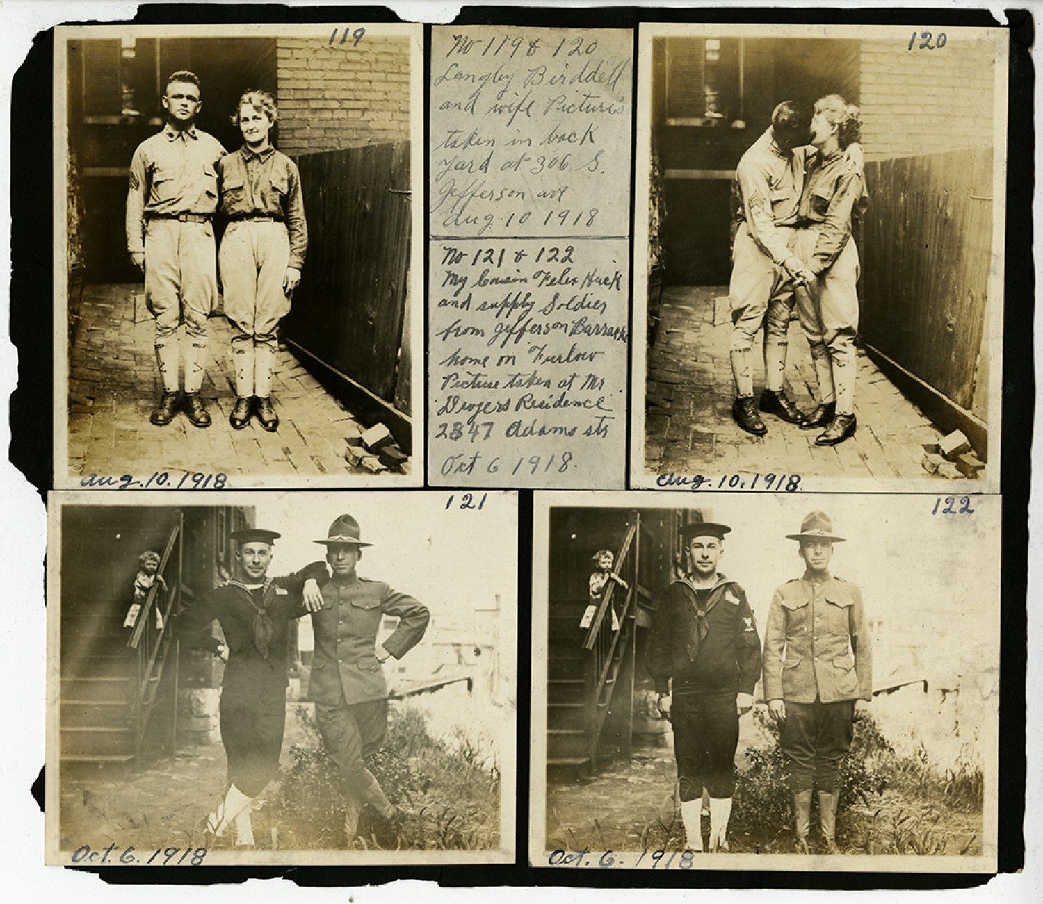 No 119 & 120 Langley Birddell and wife Pictures taken in back yard at 306 S. Jefferson ave [August] 10 1918 No 121 & 122 My Cousin Felex Buck and supply Soldier from Jefferson Barracks home on Furlow Picture taken at Mr Dwyers Residence 2347 Adams str [October] 6 1918