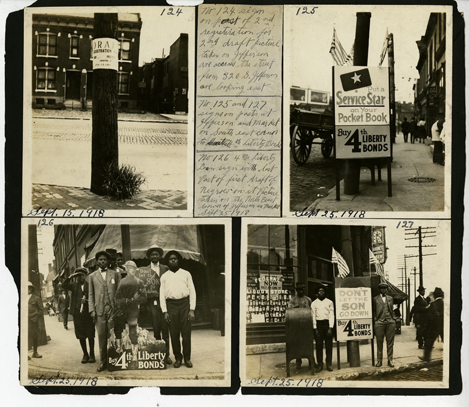 No 124 sign on post of 2nd registration for 2nd draft picture taken on Jefferson ave across the street from 320 S. Jefferson ave looking east No 125 and 127 signs on post at Jefferson and Market on South east Corner to [ms illegible: 1 wd] 4th Liberty Bonds No 126 4th Liberty Loan sign with last Part of first draft of Negroes on it Picture taken on the North East [Corner] of Jefferson an Market [September] 25 1918