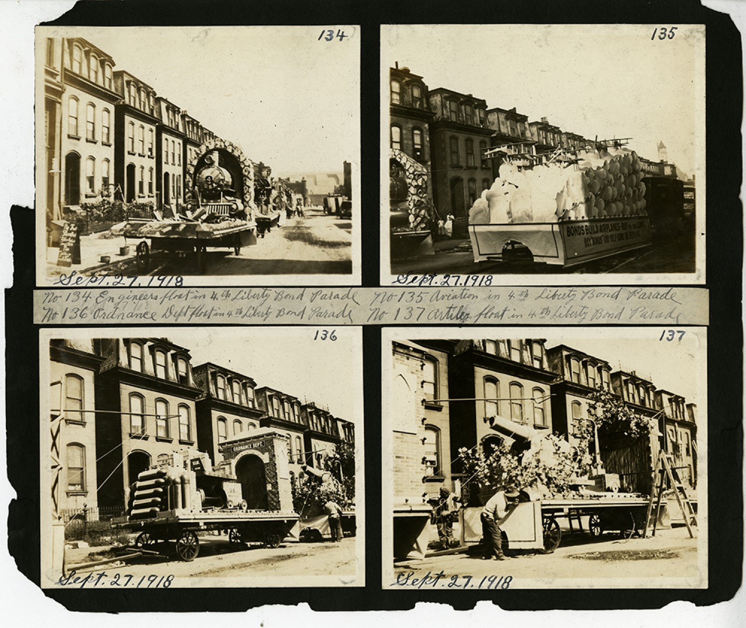No 134 Engineers float in 4th Liberty Bond Parade No 135 Aviation in 4th Liberty Bond Parade No 136 Ordnance Dept float in 4th Liberty Bond Parade No 137 [Artillery] float in 4th Liberty Bond Parade