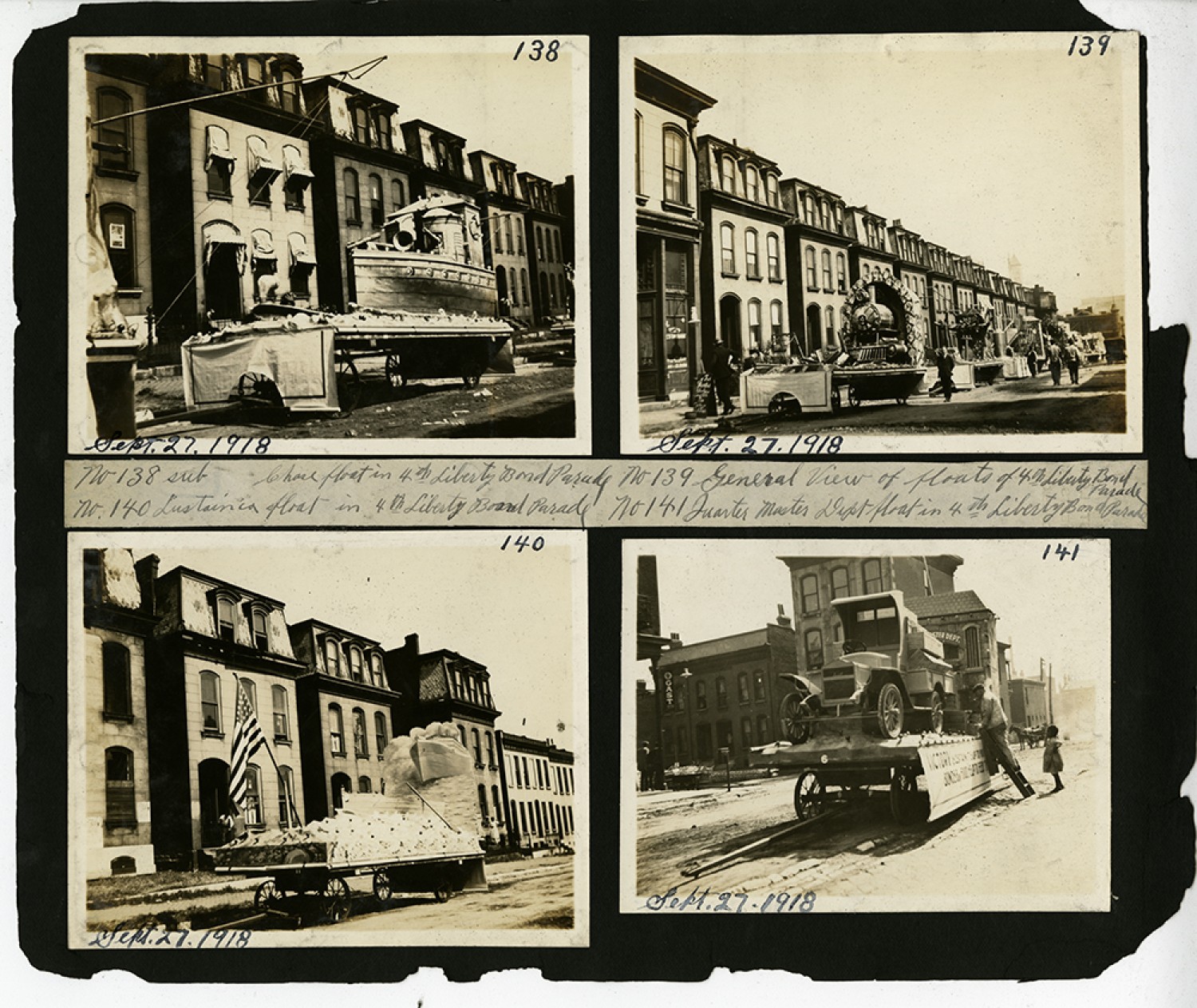 No 138 sub chase float in 4th Liberty Bond Parade No 139 General View of floats of 4th Liberty Bond Parade No 140 [Lusitania] float in 4th Liberty Bond Parade No 141 Quarter Master Dept Float in 4th Liberty Bond Parade