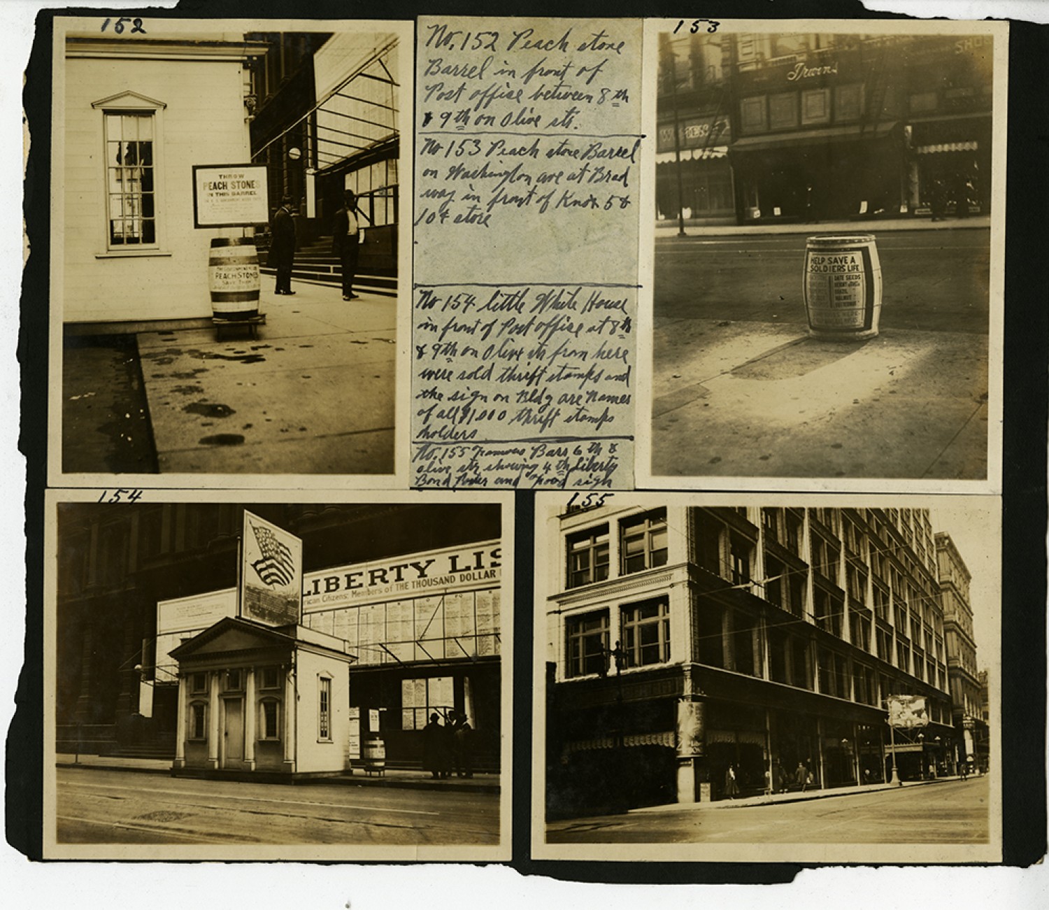 No. 152 Peach stone Barrel in front of Post office between 8th & 9th on Olive str. No 153 Peach stone Barrel on Washington ave at Brad way in front of Knox 5 & 10¢ store No 154 little White House in front of Post office at 8th & 9th on Olive str from here were sold thrift stamps and the sign on Bldg are names of all $1,000 thrift stamps holders No. 155 Famous Bars 6th & olive str showing 4th Liberty Bond Poster and Food sign