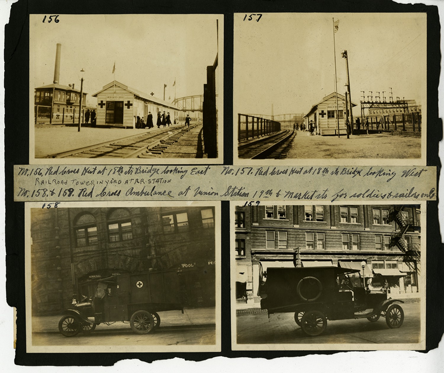 No. 156 Red Cross Hut at 18th str Bridge looking East No. 157. Red Cross Hut at 18th Str Bridge looking West RailRoad Tower in yard at RR Station No. 158. & 159. Red Cross Ambulance at Union Station 19th & Market str for soldiers & sailors only