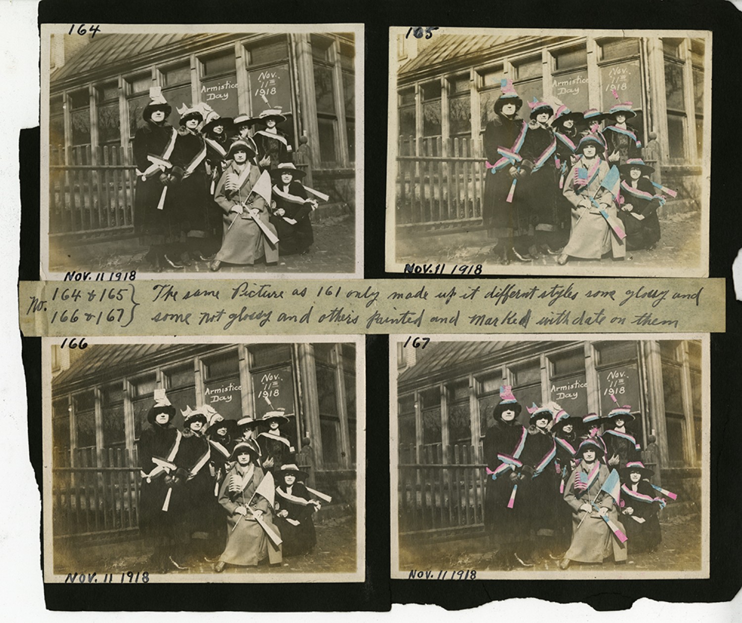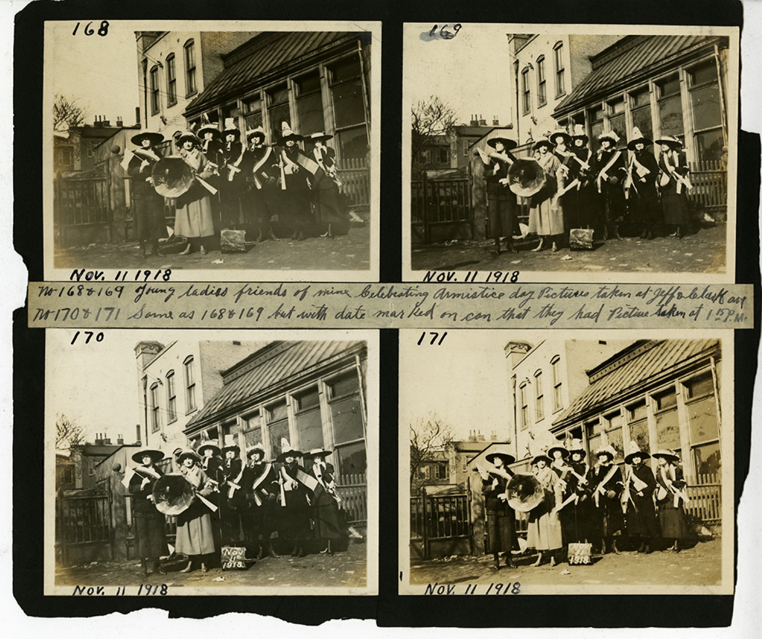 No 168 & 169 Young ladies friends of mine Celebrating Armistice day Pictures taken at Jeff & Clark ave No 170 & 171 Same as 168 & 169 but with date marked on can that they had Picture taken at 1:15 P.M.