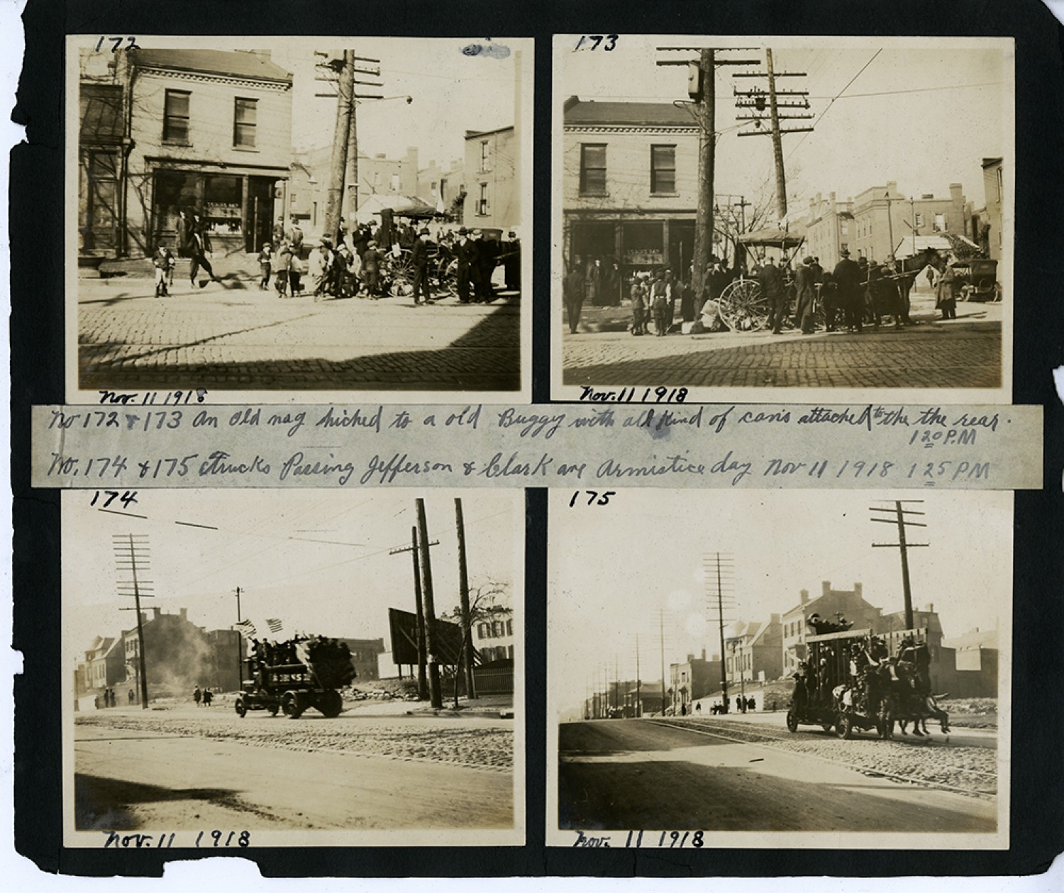 No 172 & 173 An Old nag hiched to a old Buggy with all kind of cans attached to the rear 1:20 P.M No. 174 & 175 trucks Passing Jefferson & Clark Ave Armistice day [November] 11 1918 1:25 PM