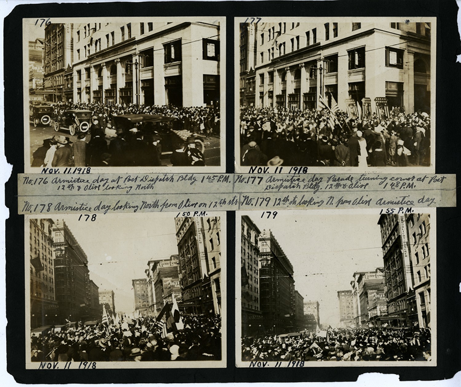 No. 176 Armistice day at Post Dispatch Bldg 1:45 P.M. 12th & Olive Looking North No. 177 Armistice day Parade turning cornor at Post Dispatch Bldg. 12th & Olive 1:48 P.M. No. 178 Armistice day looking North from Olive on 12th str No. 179 12th looking N. from Olive Armistice day