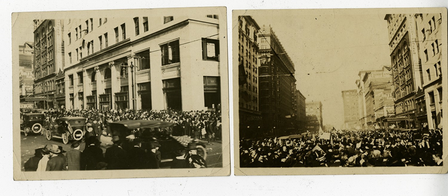 No 160, 162, 163. [November] 11 1918 Armistice day showing Crowds and the way people acted on that day Picture taken from Post Dispatch Bldg one looking south on 12th str and the other 2 looking down on the people this is one of the examples of how People Celebrated all over town all day long No 161 A gorope of of young ladies Friends of Mine Celebrating Armistice day Picture taken at Jefferson & Clark ave [November] 11 1918 at 1:15 P.M.