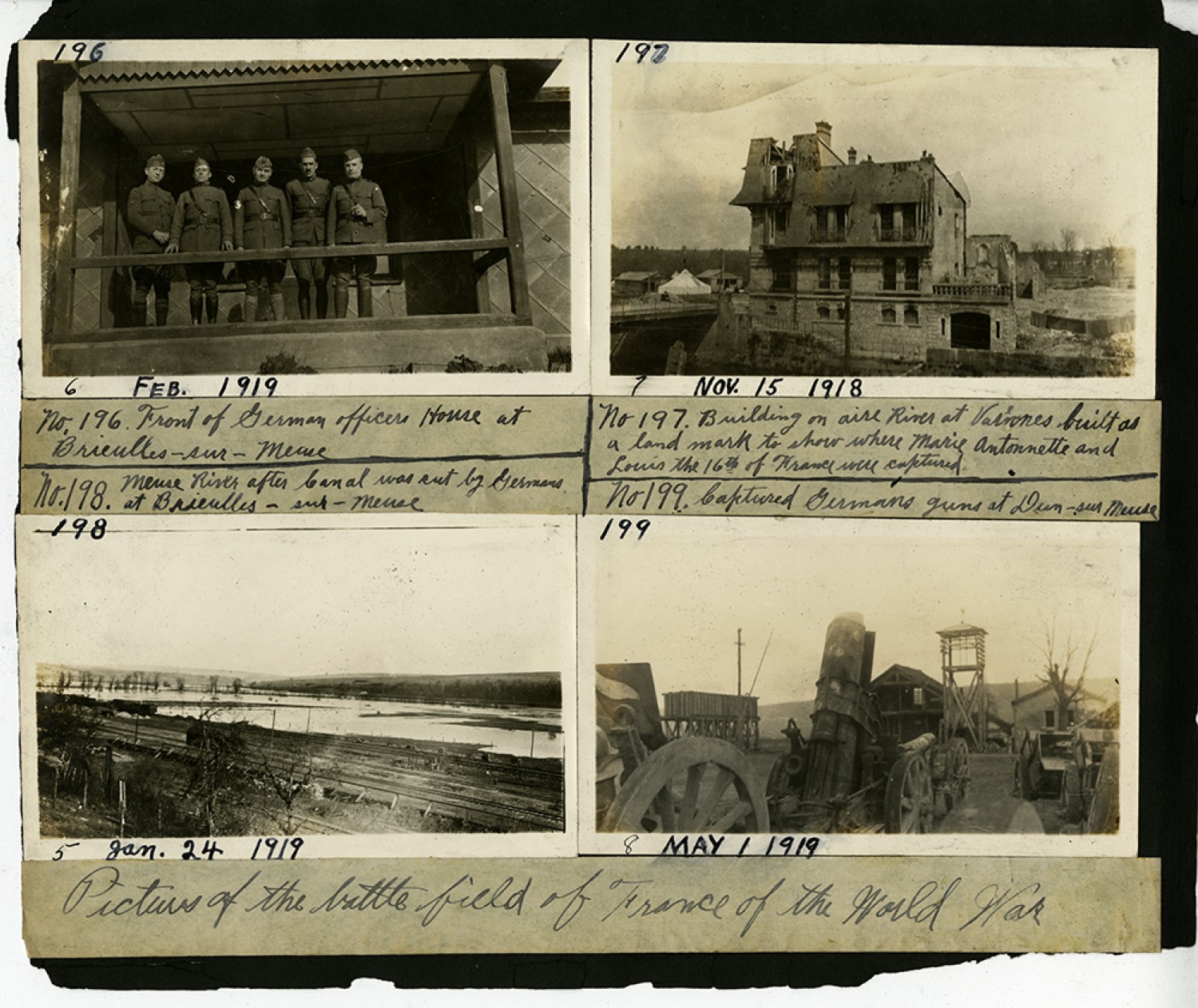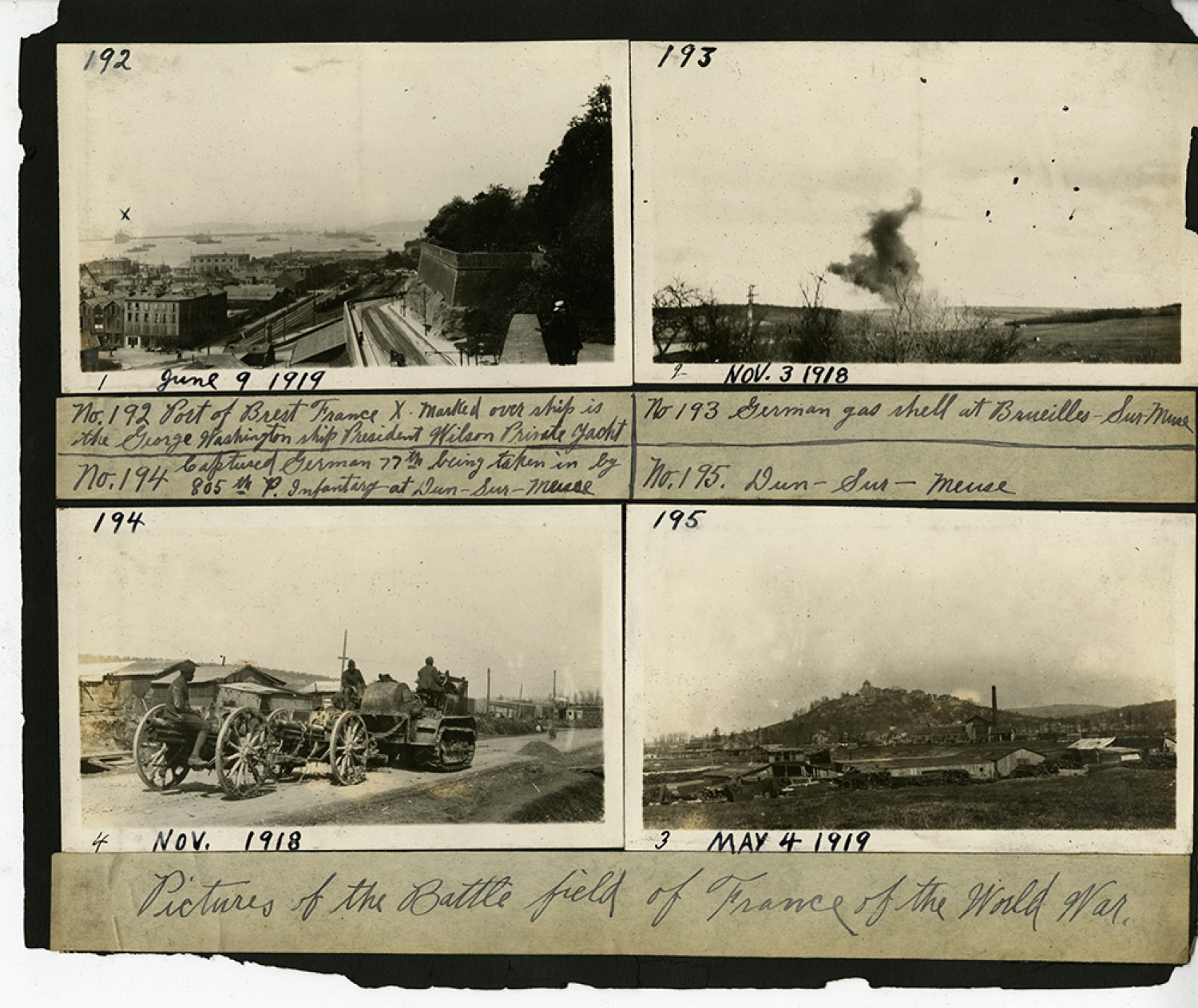 No. 192 Port of Brest France X marked over ship is the George Washington ship President [Woodrow] Wilson Private yacht No 193 German gas shell at [Brieulles] – Sur-Meuse No 194 Captured German 77th being taken in by 805th P. Infantry at Dun-Sur-Muse No. 195. Dun-Sur-Meuse Pictures of the Battle field of France of the World War